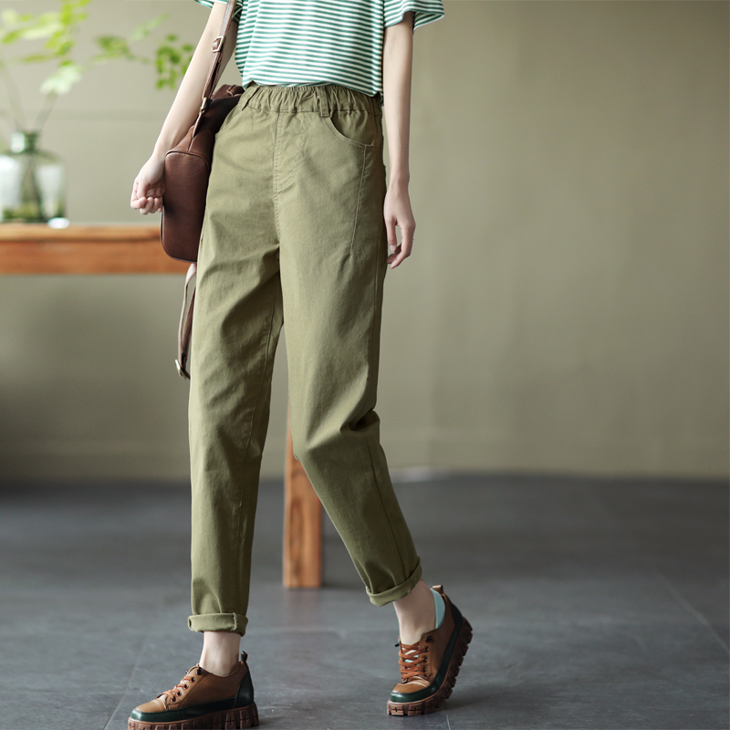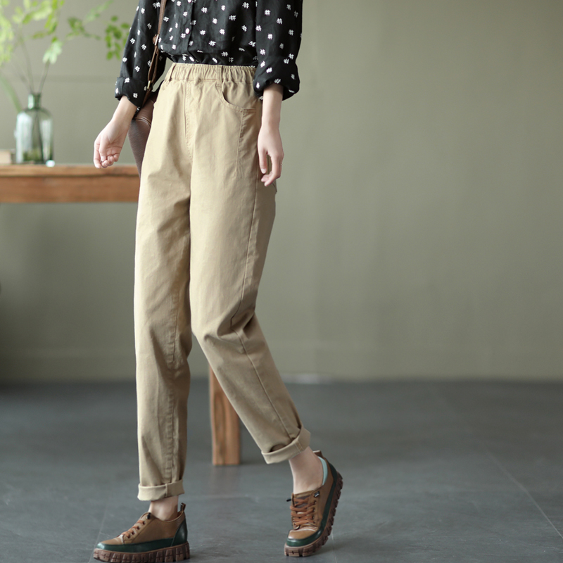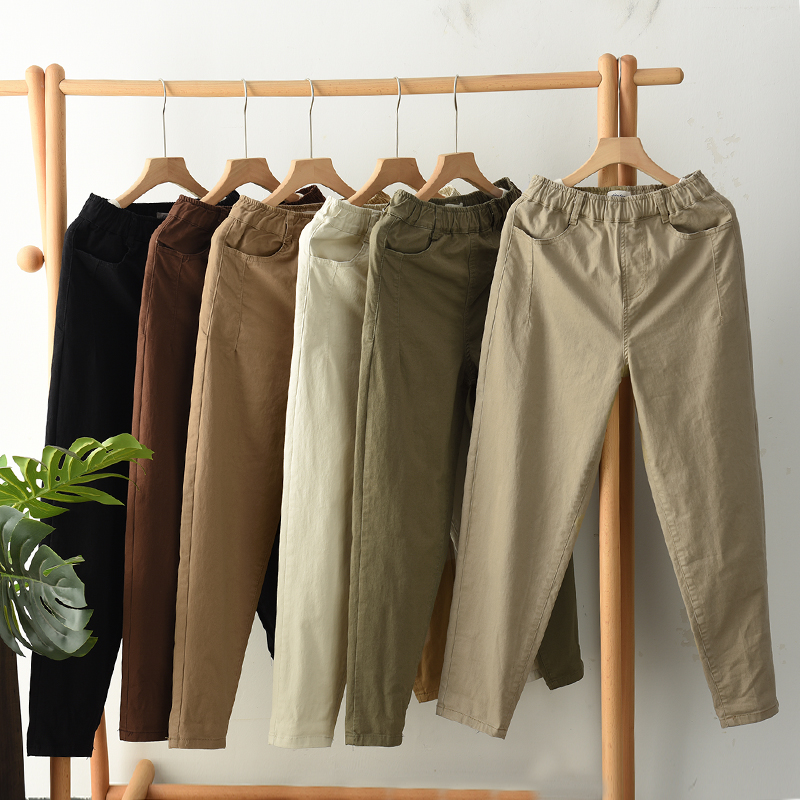 园园美衣新款复古文艺全棉休闲裤女松紧腰显瘦直筒裤百搭纯色长裤