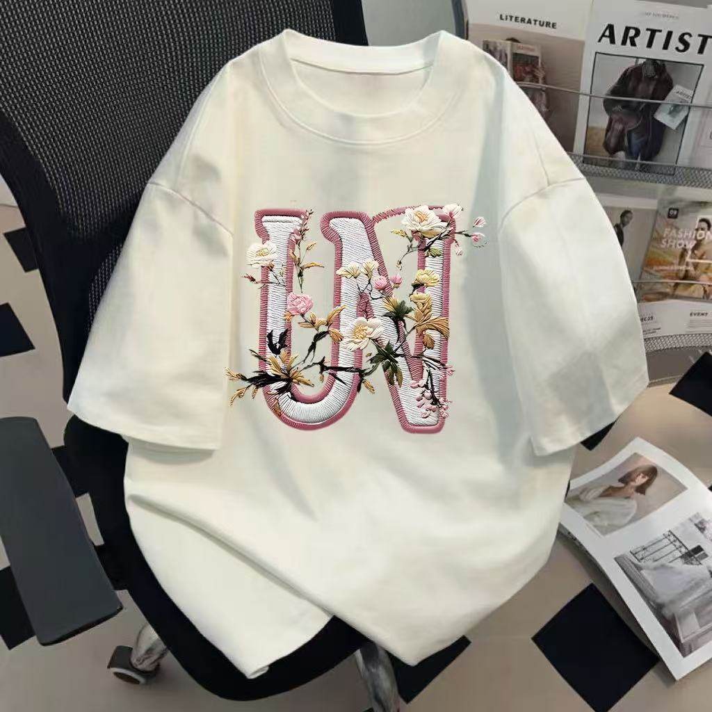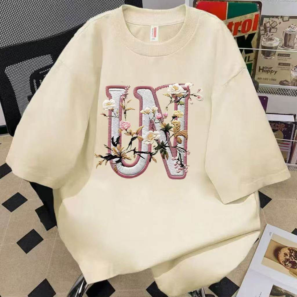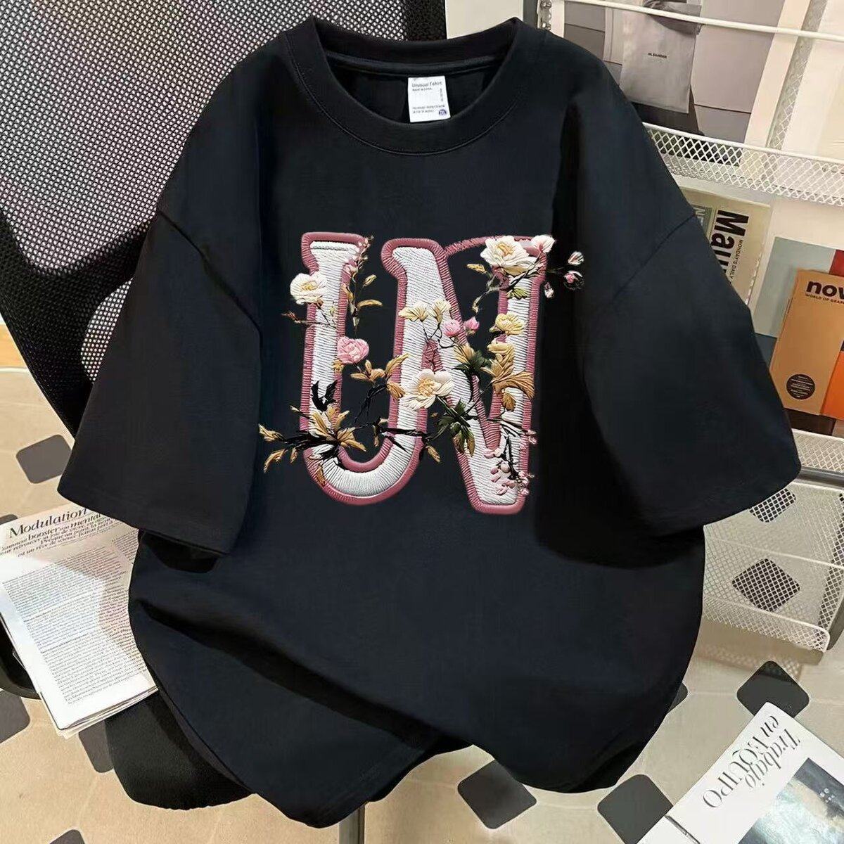 鲜花设计感粉色字母W印花短袖T恤男女夏季休闲情侣款宽松半袖上衣