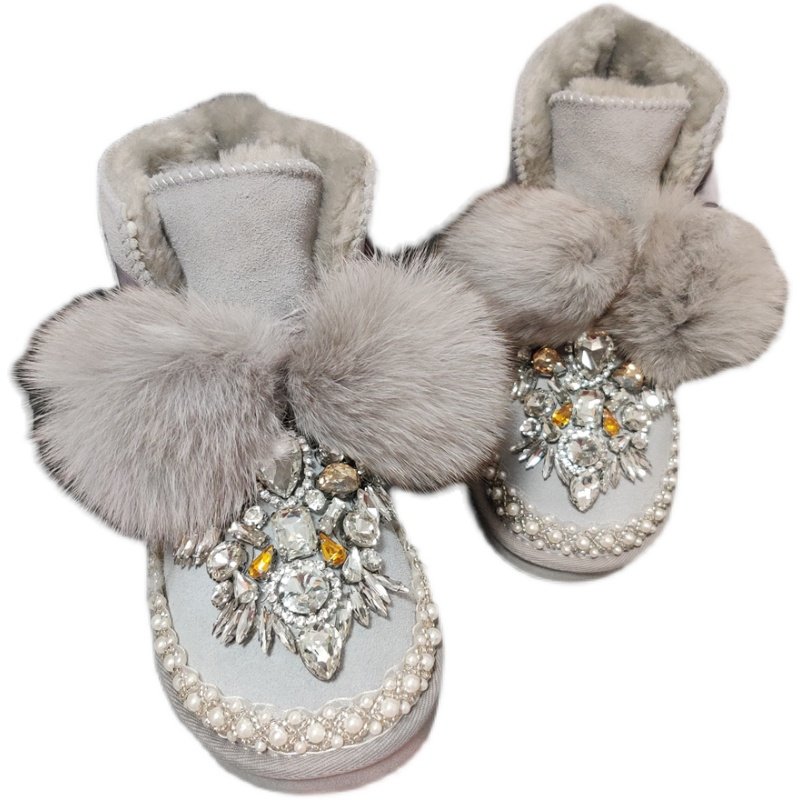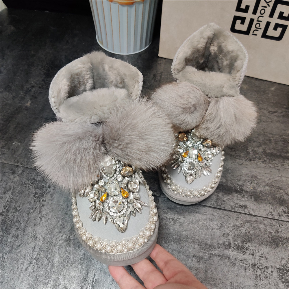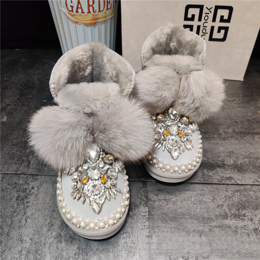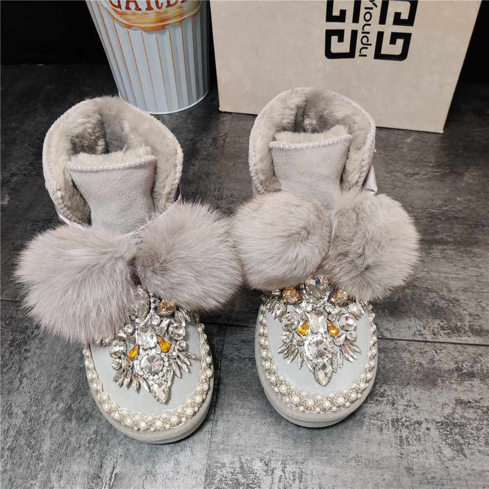 新款手工镶钻狐狸毛球加绒雪地靴