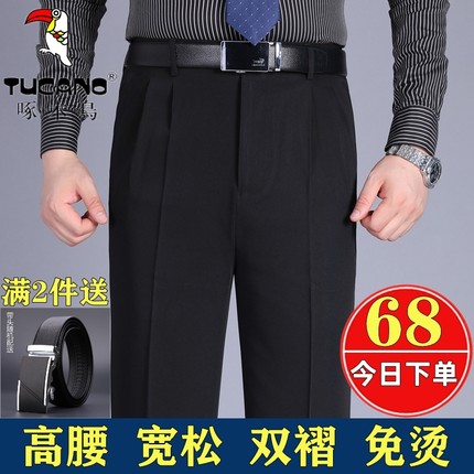 啄木鸟双褶西裤男秋季厚款中老年免烫垂顺男裤高腰深裆西装裤长裤