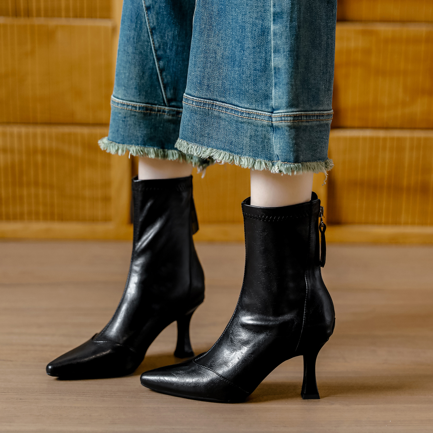 真皮黑色尖头细跟高跟短靴女7cm2025秋冬加绒弹力瘦瘦后拉链气质