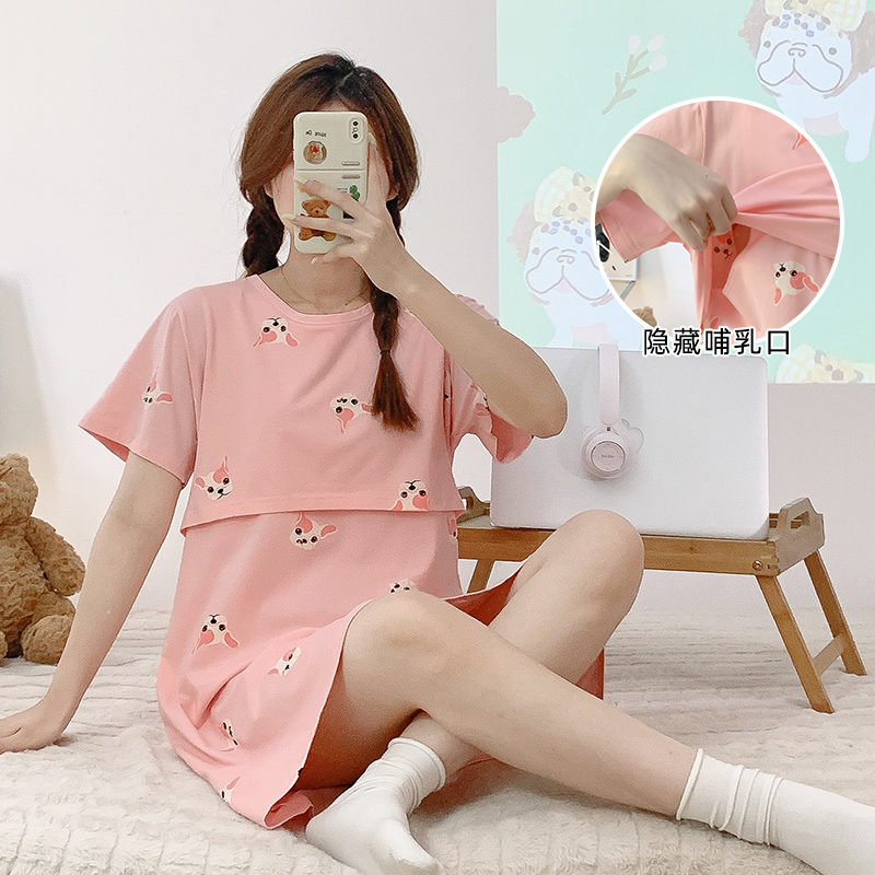 孕妇睡衣夏季哺乳连衣裙宽松短袖A爽棉产后喂奶衣哺乳睡裙薄月子