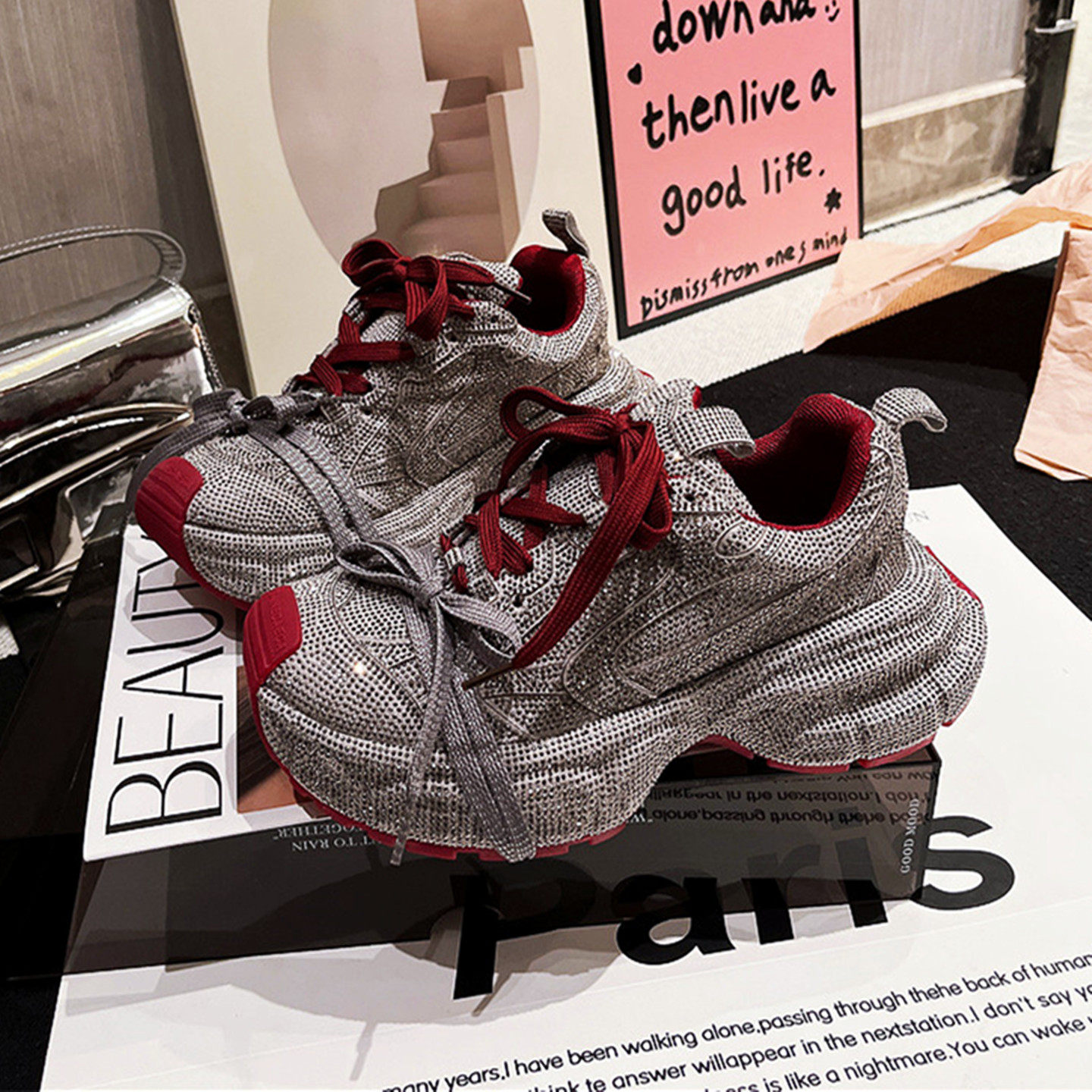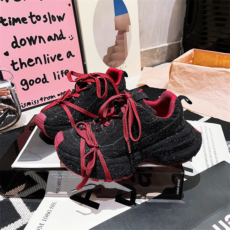 欧洲站老爹鞋女ins超火水钻满钻绑带休闲鞋红色小众设计帅气女鞋