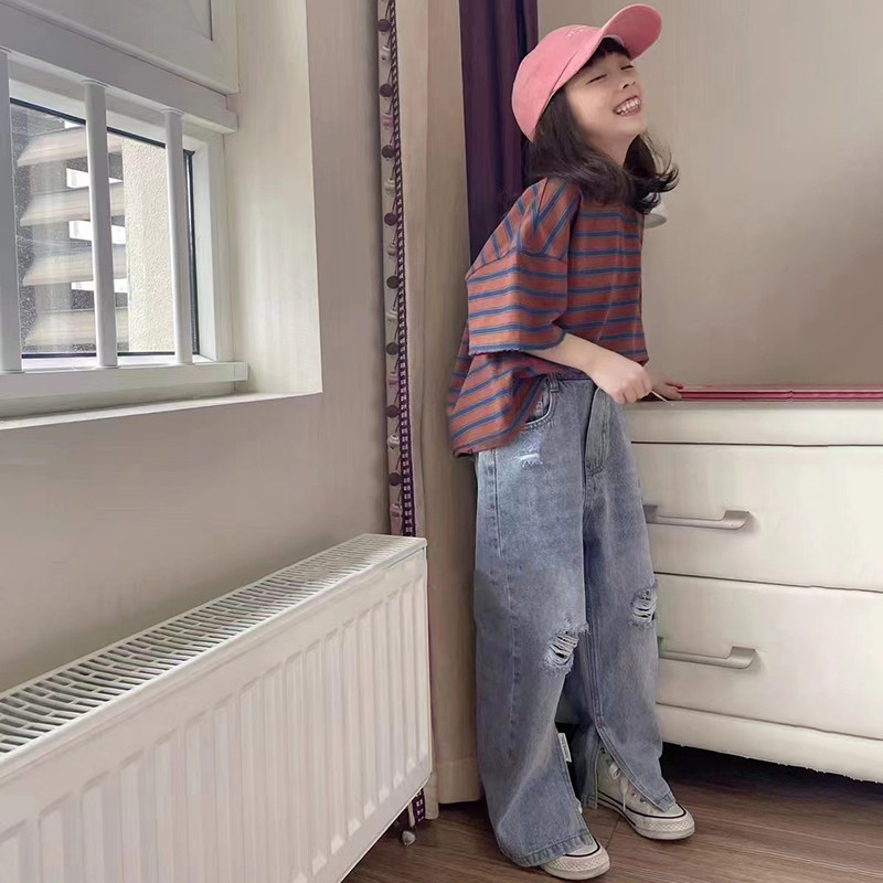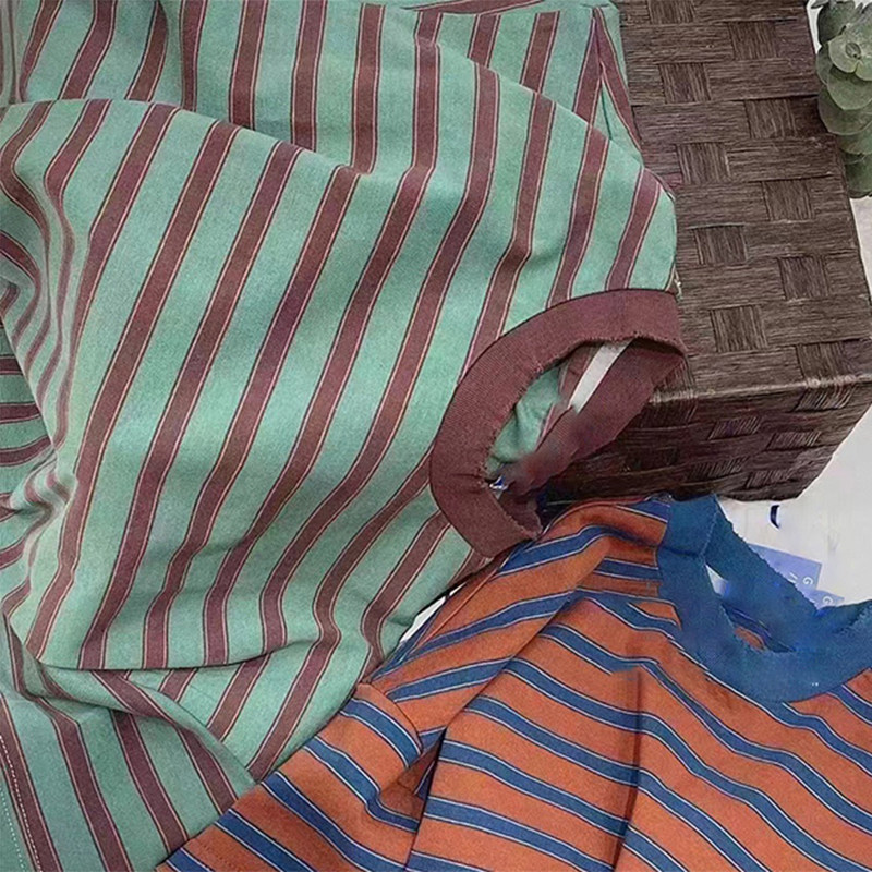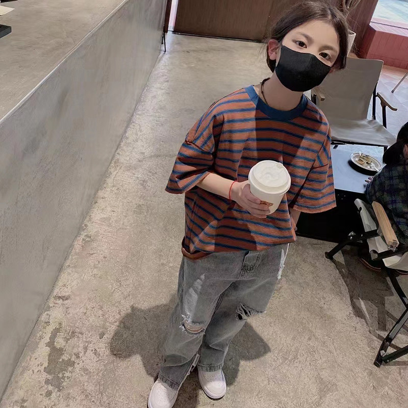 韩国童装男童女童条纹T恤2025夏装儿童短袖拼色t中大童宽松上衣潮