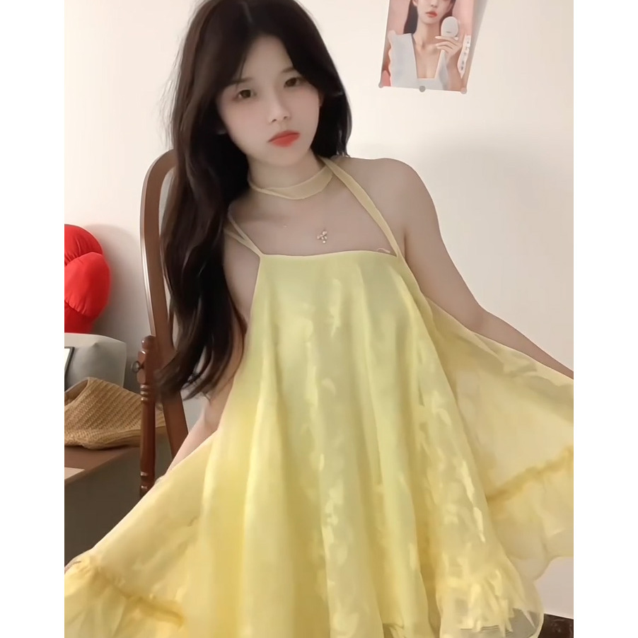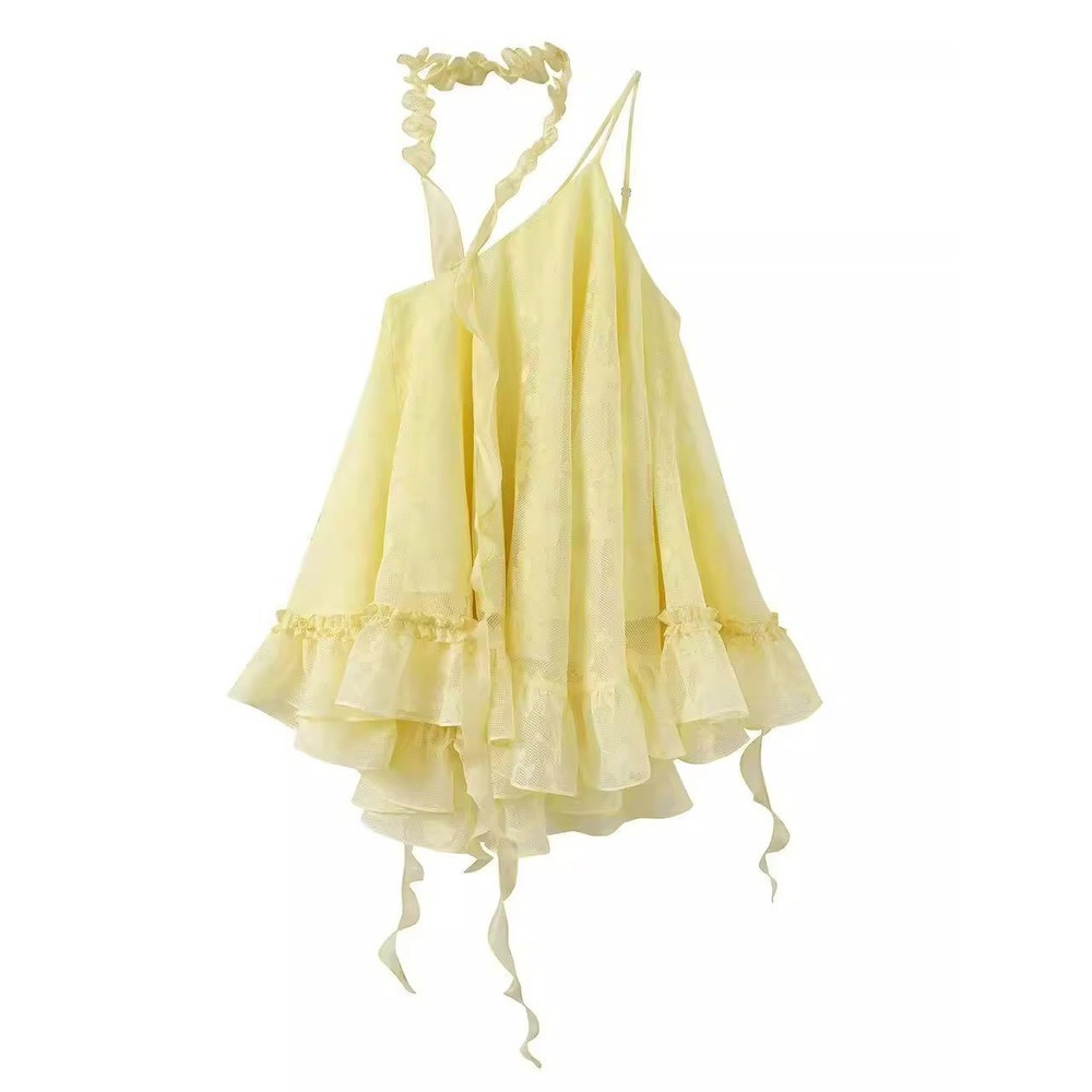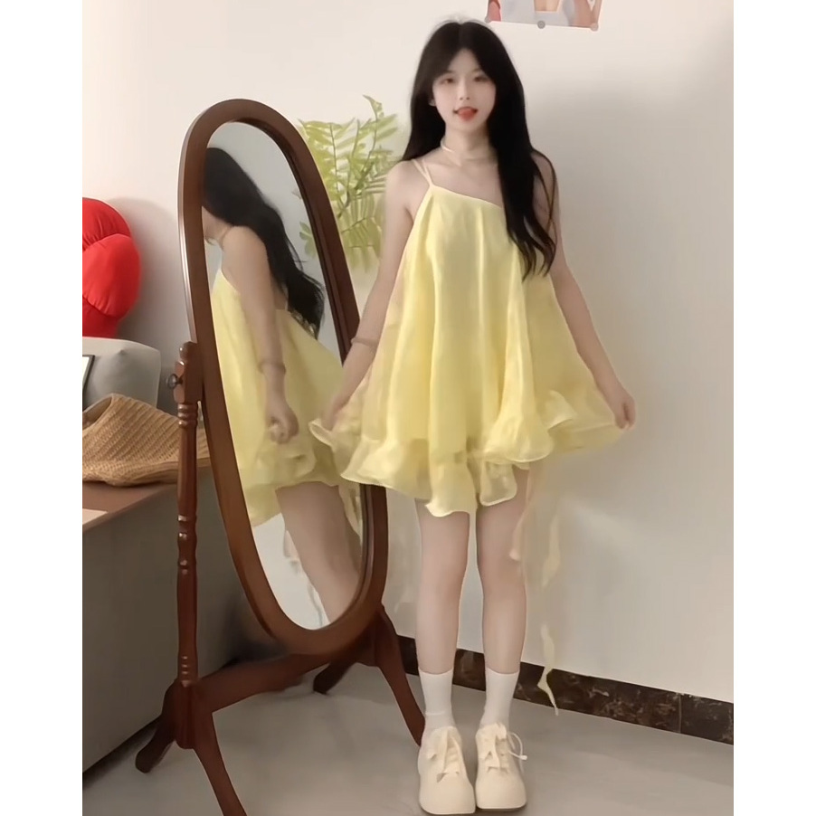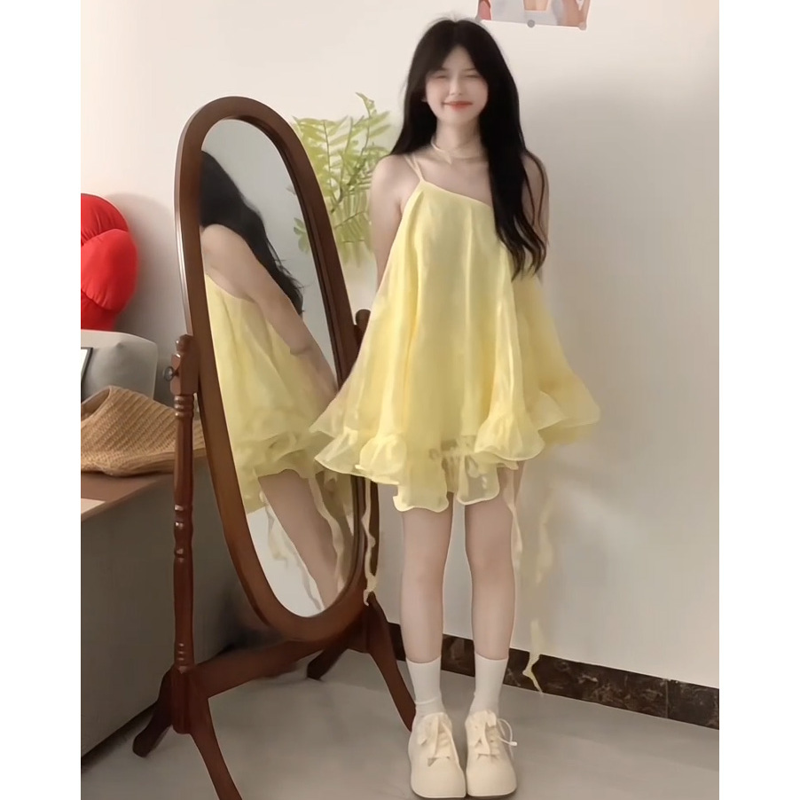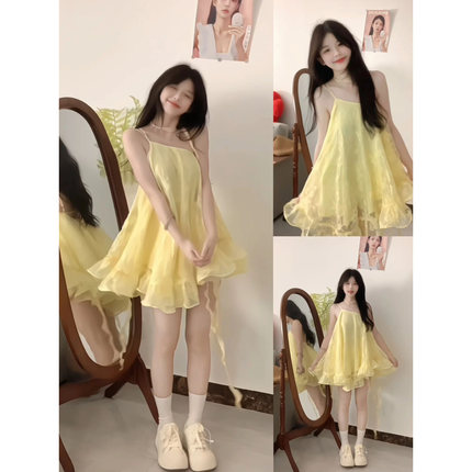赵露思同款黄色不规则斜肩吊带连衣裙女夏季小个子海边度假蓬蓬裙