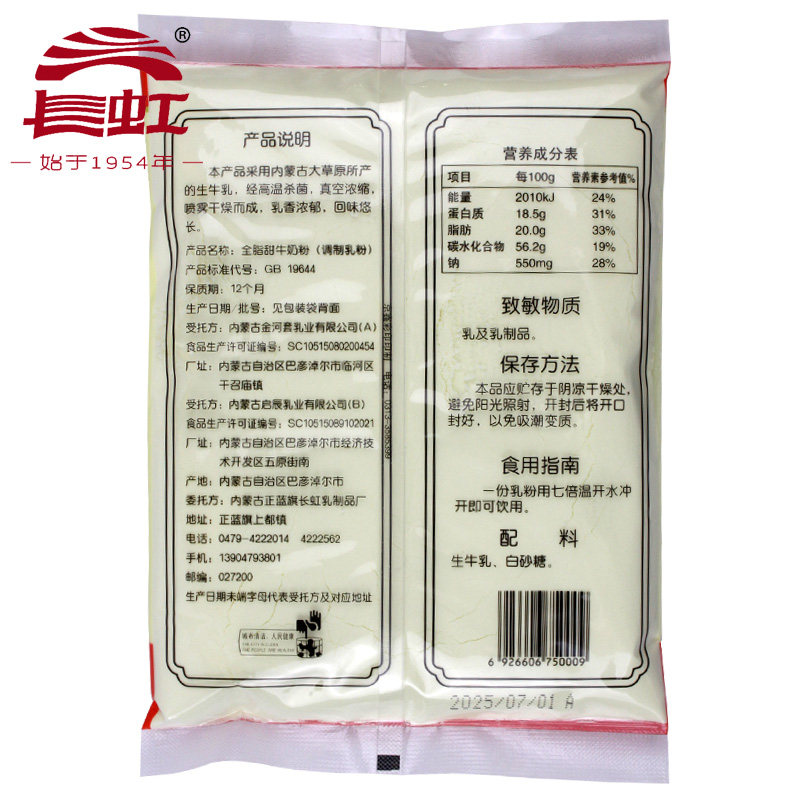内蒙古蓝旗特产长虹速溶全脂甜牛奶粉成人中老年中学生每袋325g