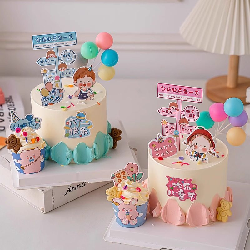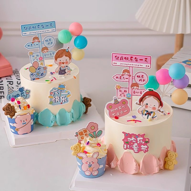 儿童节蛋糕装饰摆件简约可爱男女孩配件健康快乐每一天指路牌插件