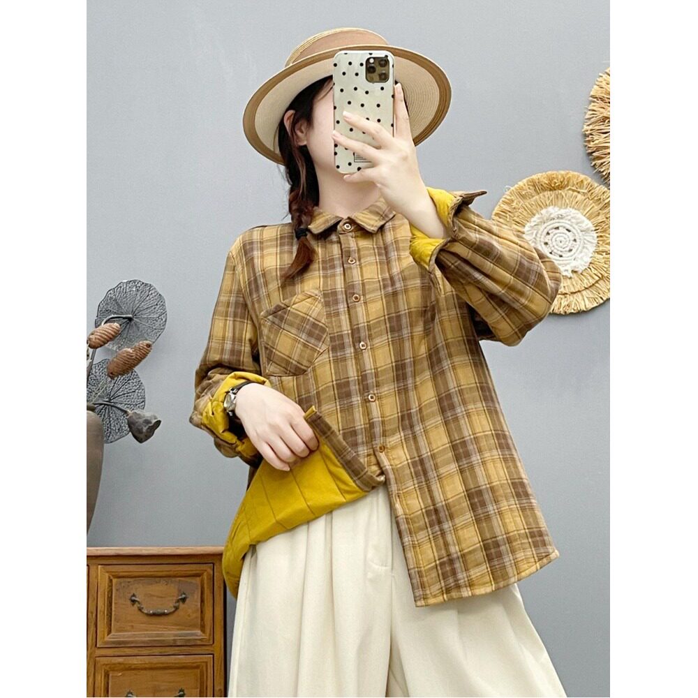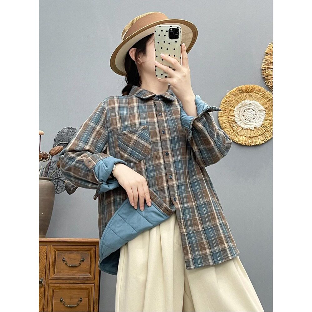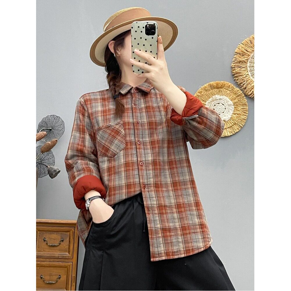 慵懒风宽松格纹POLO领衬衫女冬装加棉保暖棉衣通勤叠穿打底衫上衣