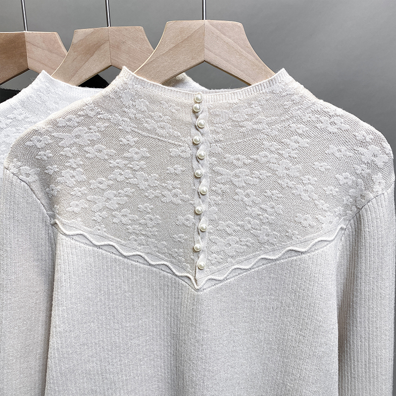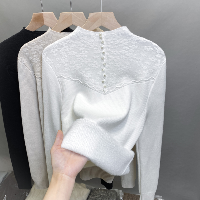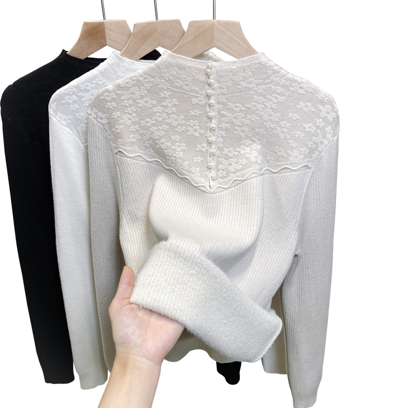 一体绒半高领毛衣女加绒厚打底衫2025秋冬新款蕾丝针织衫内搭上衣