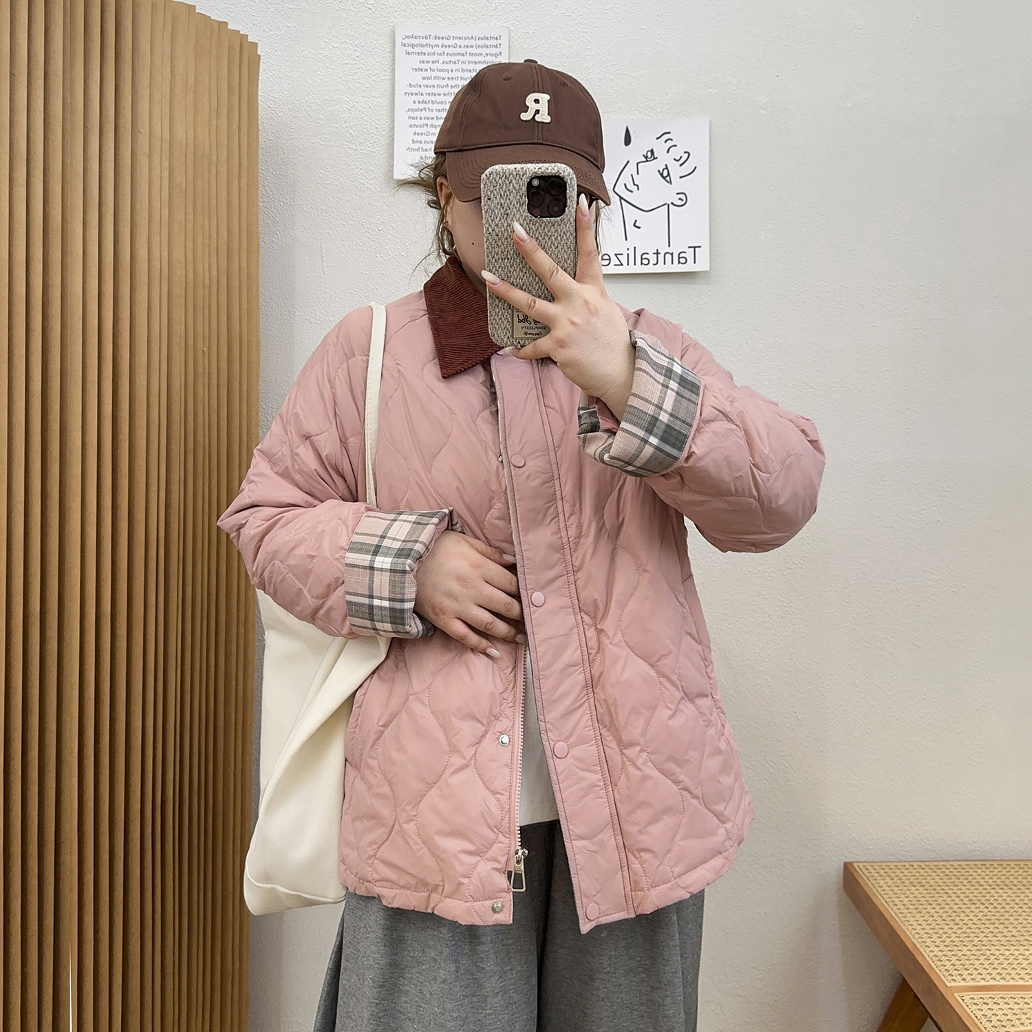 宛宛大码女装韩系复古菱格羽绒服2025冬季胖mm撞色翻领白鸭绒外套