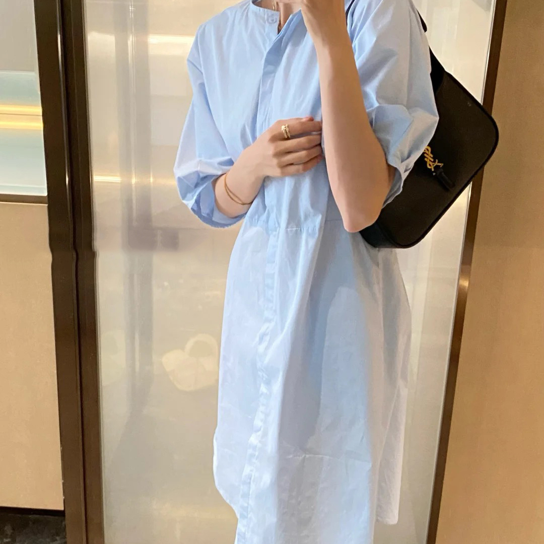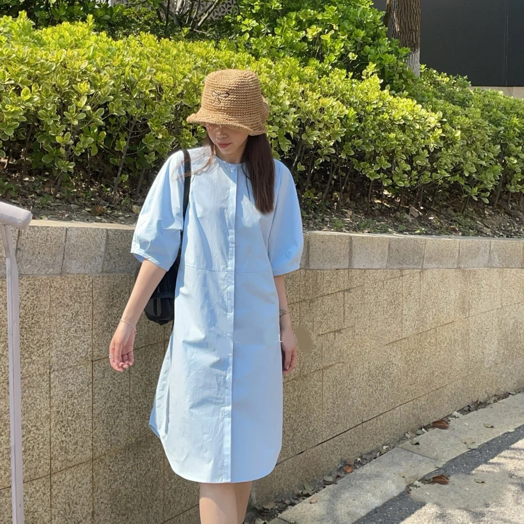 【斜纹高密100棉!】夏季圆领蓝色中长款连肩泡泡袖衬衫连衣裙女