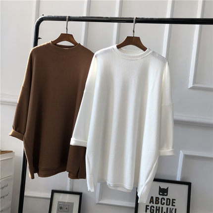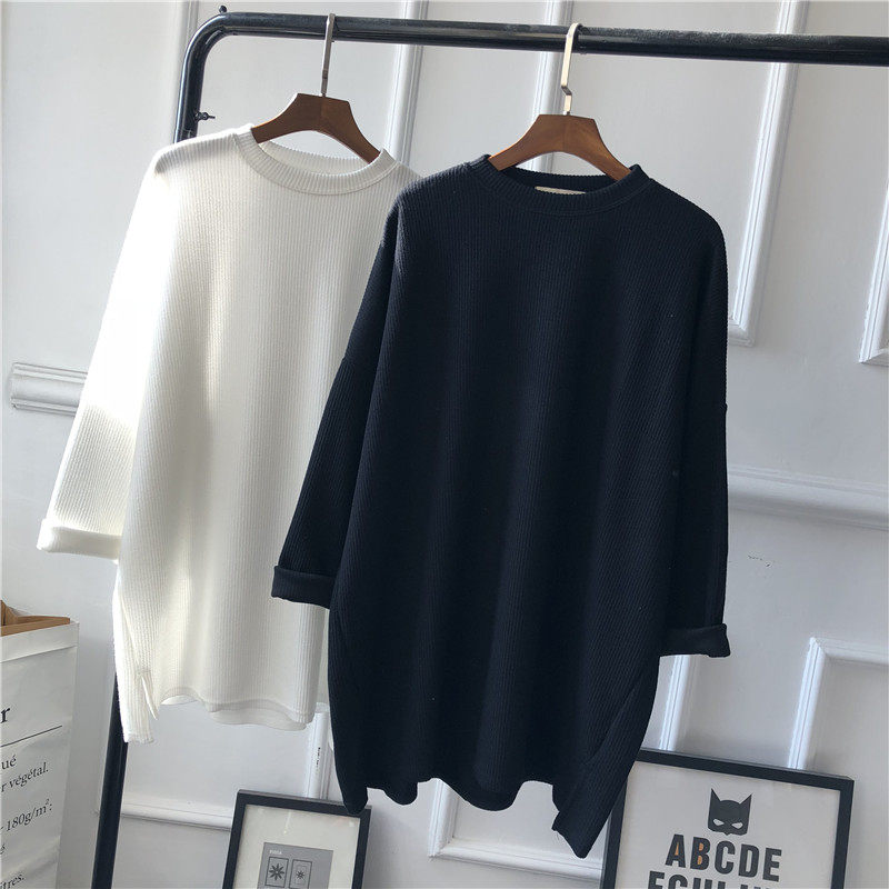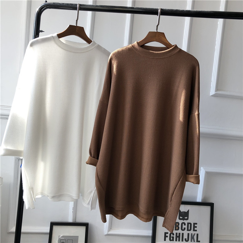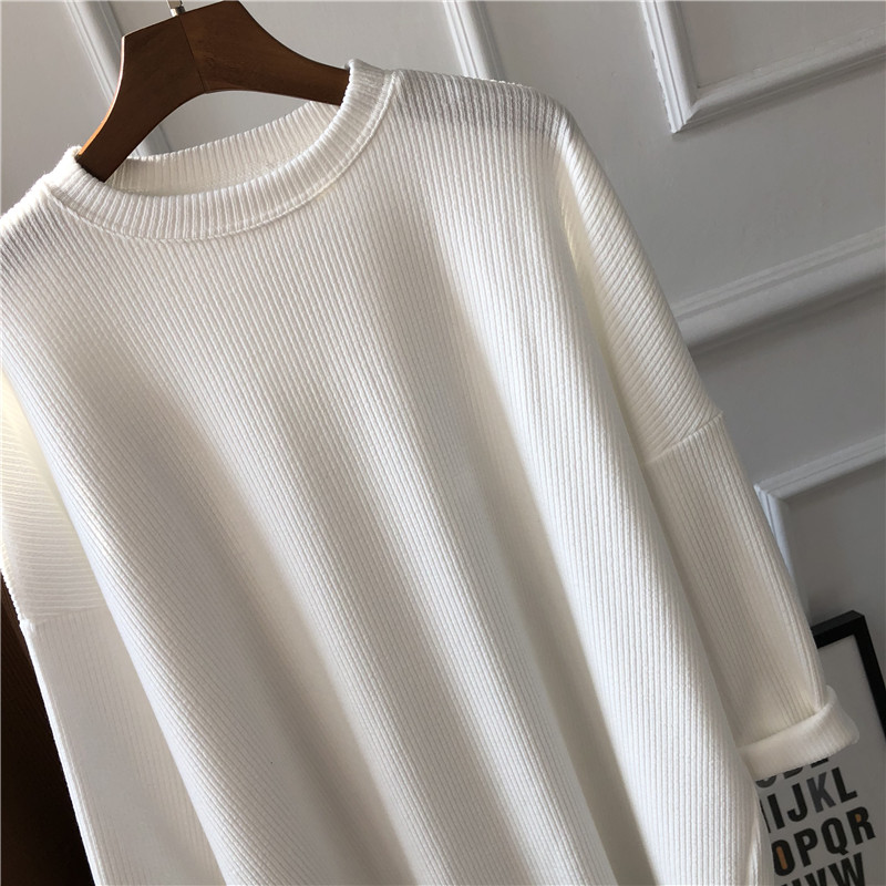 秋冬中长款半高领针织衫女长袖套头宽松白色螺纹毛衣打底衫上衣