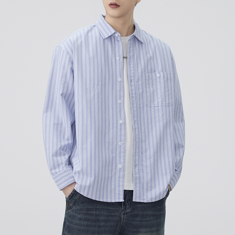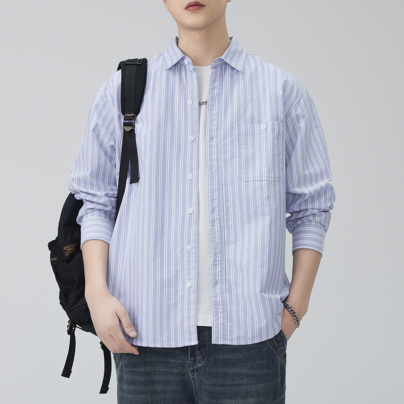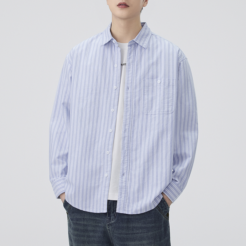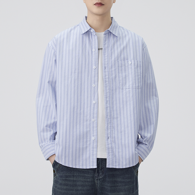 JIINOO男女基础蓝白条纹衬衫日系休闲纯棉宽松口袋长衬衫秋季新款