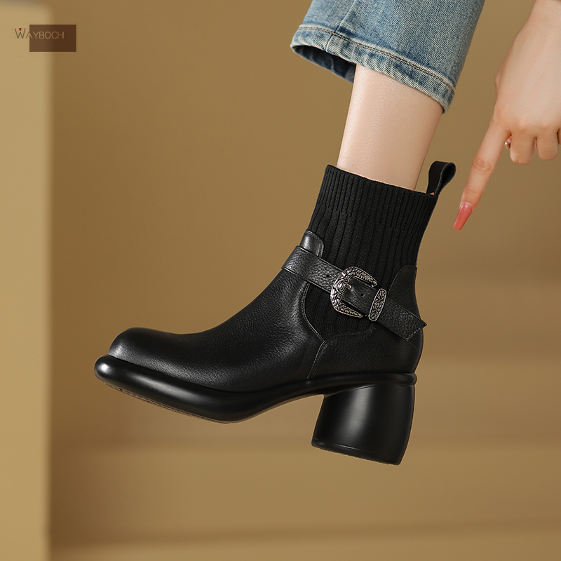 头层牛皮粗跟弹力袜靴厚底防水台圆头短靴子女高跟真皮针织套筒秋