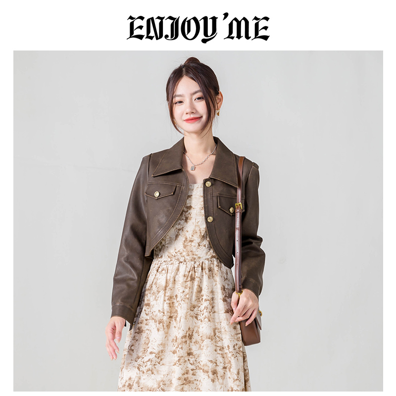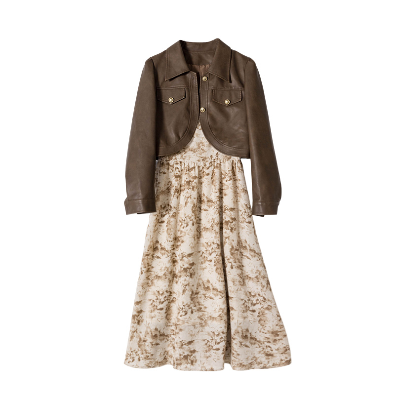 ENJOYME气质套装女2023秋季新款碎花吊带裙复古皮衣修身显瘦外套