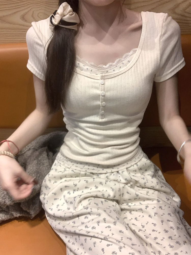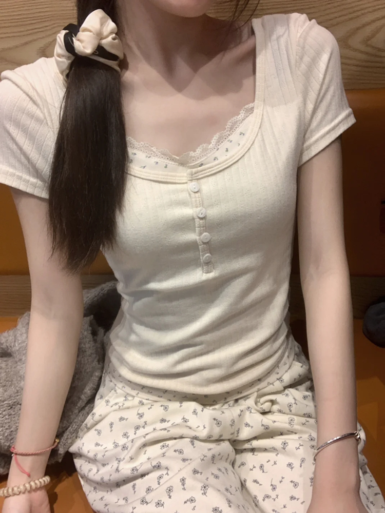 夏季圆领修身显瘦正肩t恤女短袖甜辣短款纯欲蕾丝碎花假两件上衣