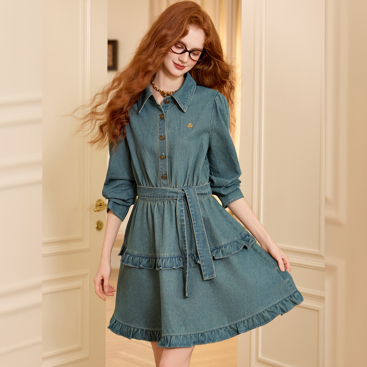 白鹿语木耳边蝴蝶结系带牛仔连衣裙25秋新款设计感减龄收腰中长裙