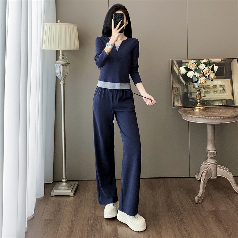 显瘦假两件上衣阔腿裤运动两件套