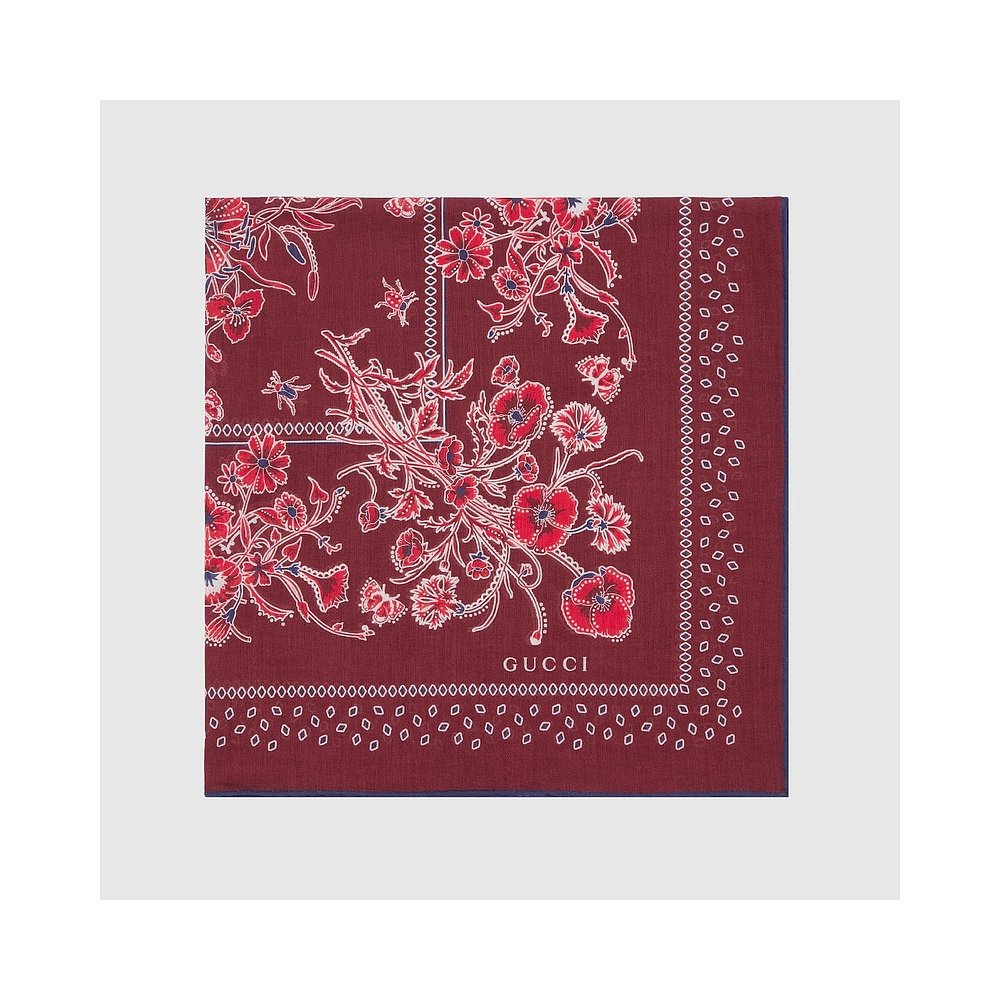 自营欧洲直邮Gucci/古驰 男士酒红色棉纱花卉印花方巾