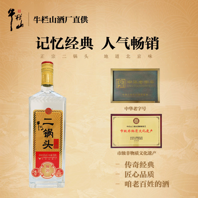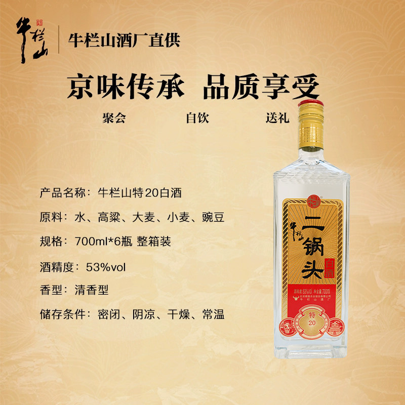牛栏山二锅头 53度特(20)清香型 700ml*6瓶纯粮高度白酒整箱