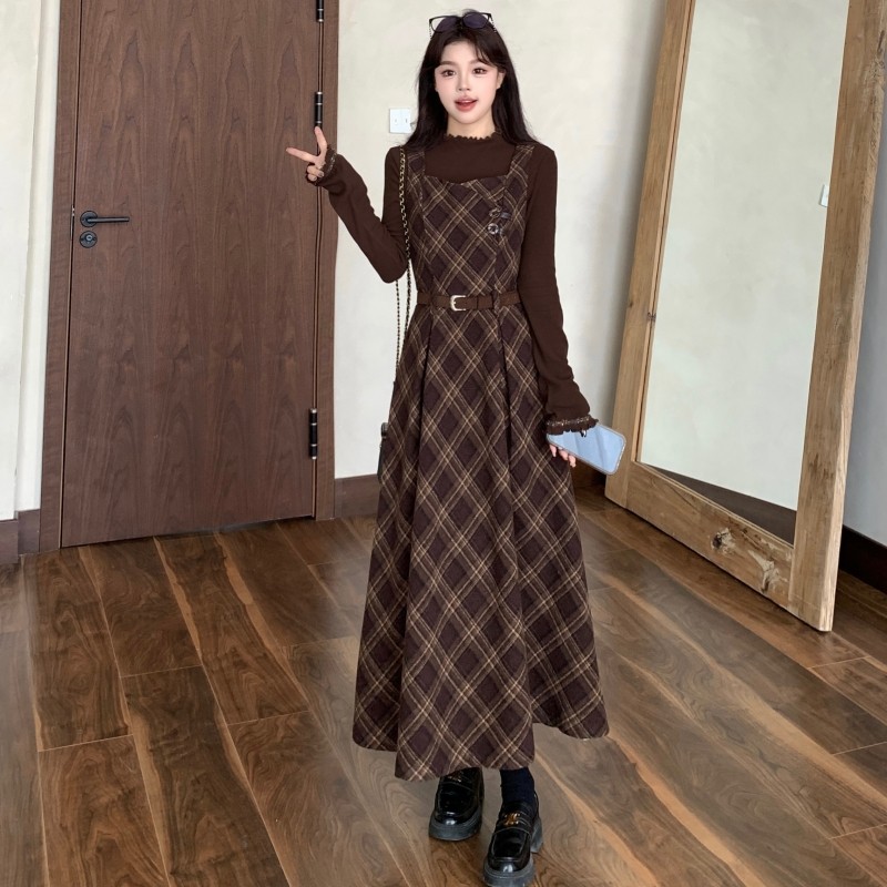 格纹连衣裙针织打底衫两件套装
