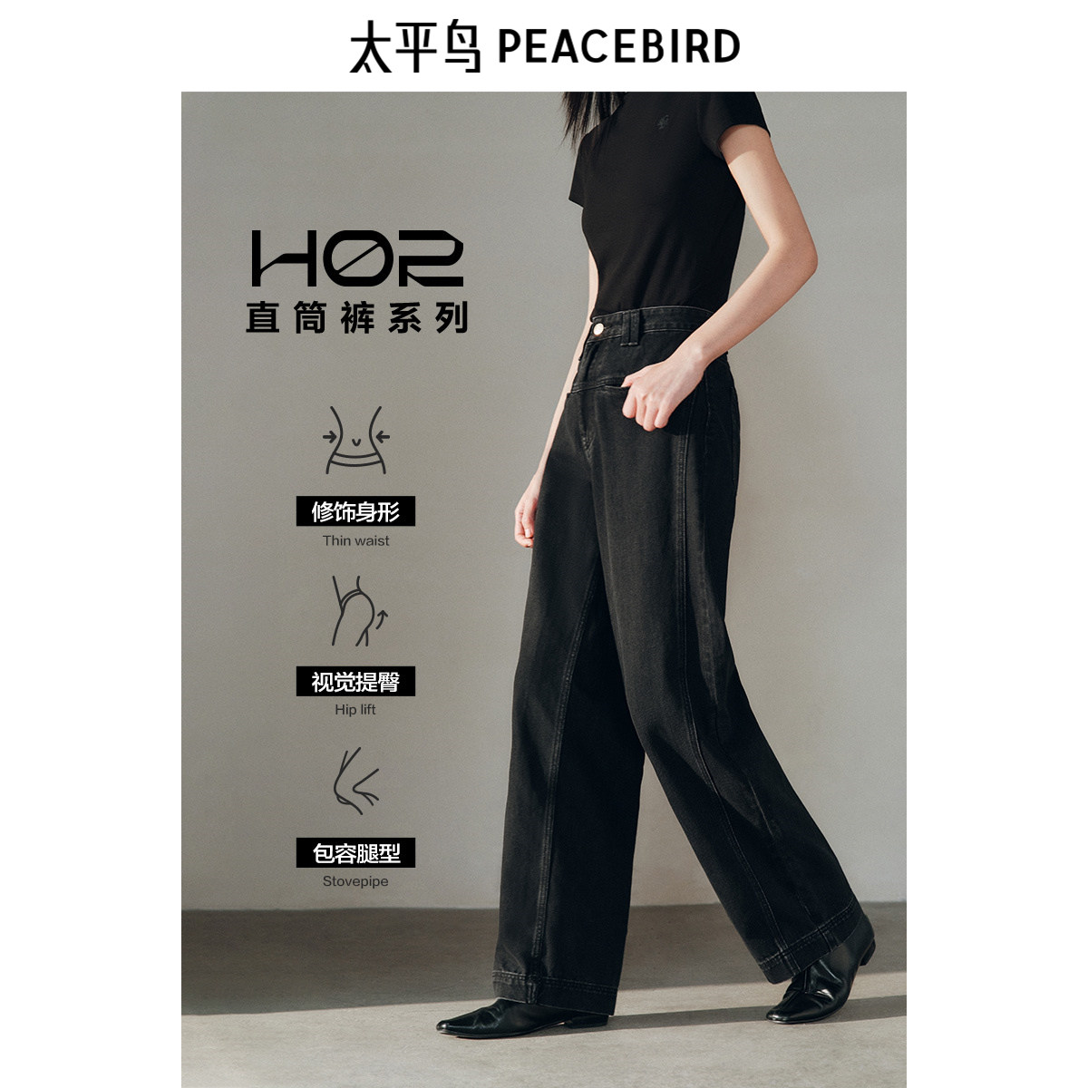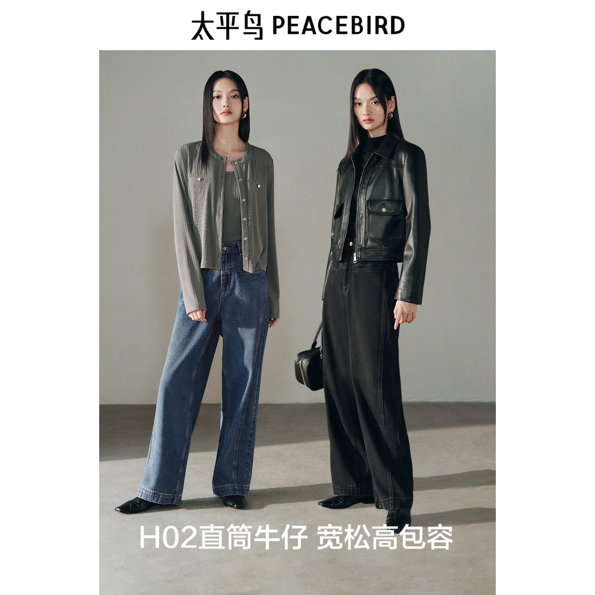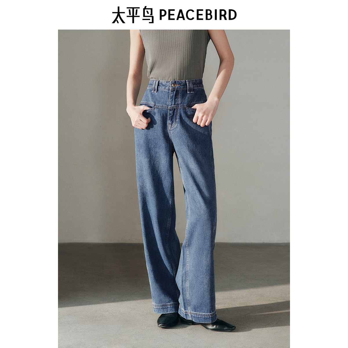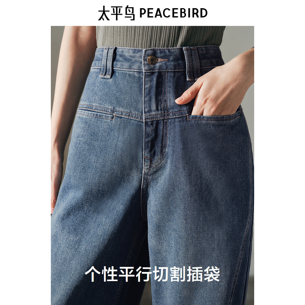 太平鸟复古高腰直筒牛仔裤春季宽松显瘦阔腿直筒裤子女奥莱