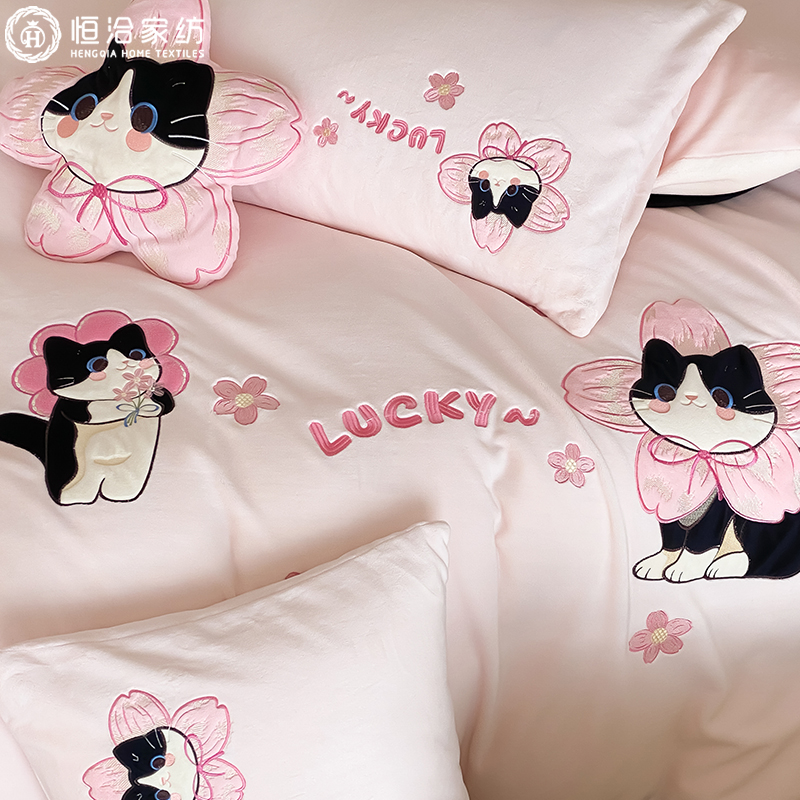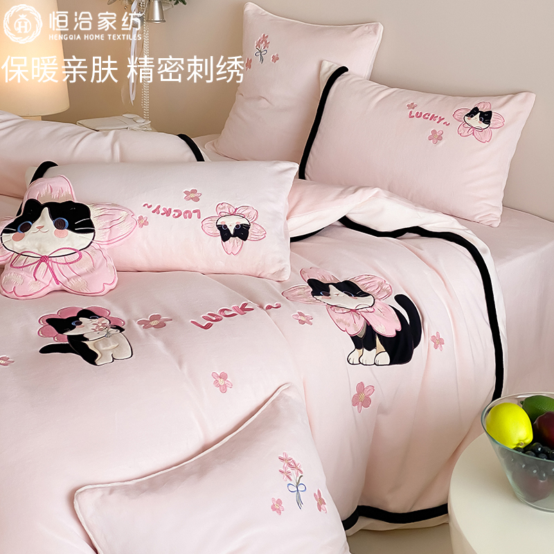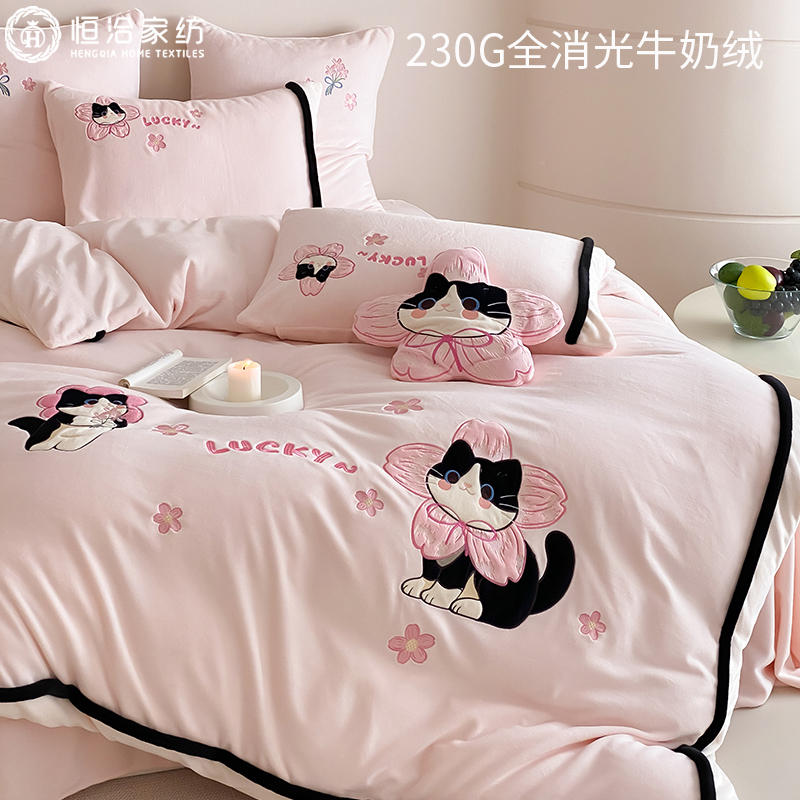 冬季儿童230G全消光牛奶绒四件套卡通风可爱猫刺绣被套床品粉色
