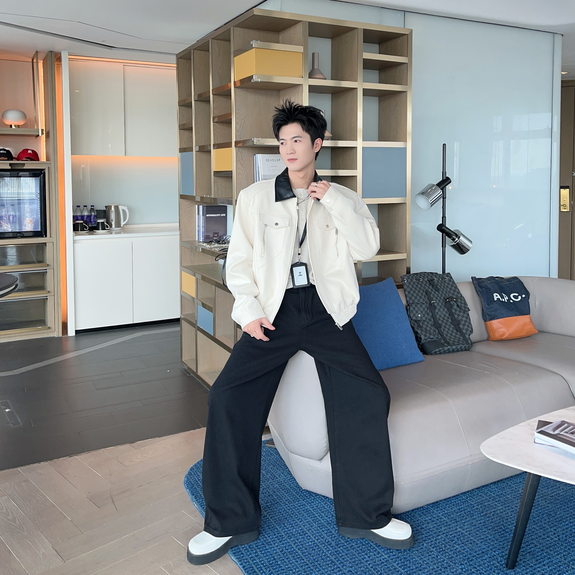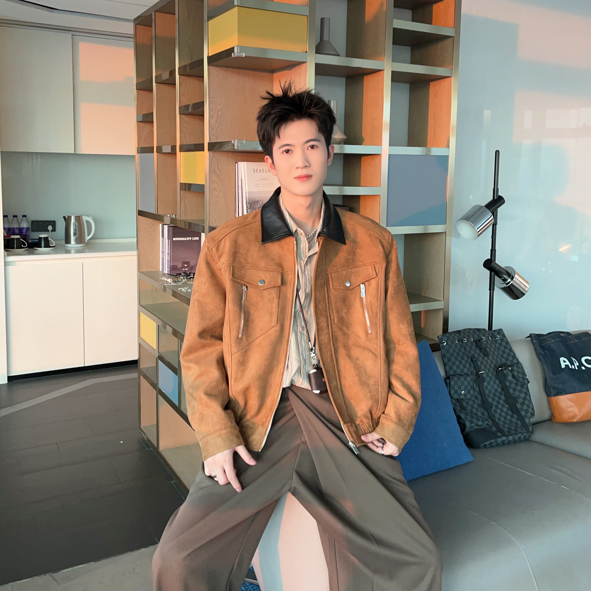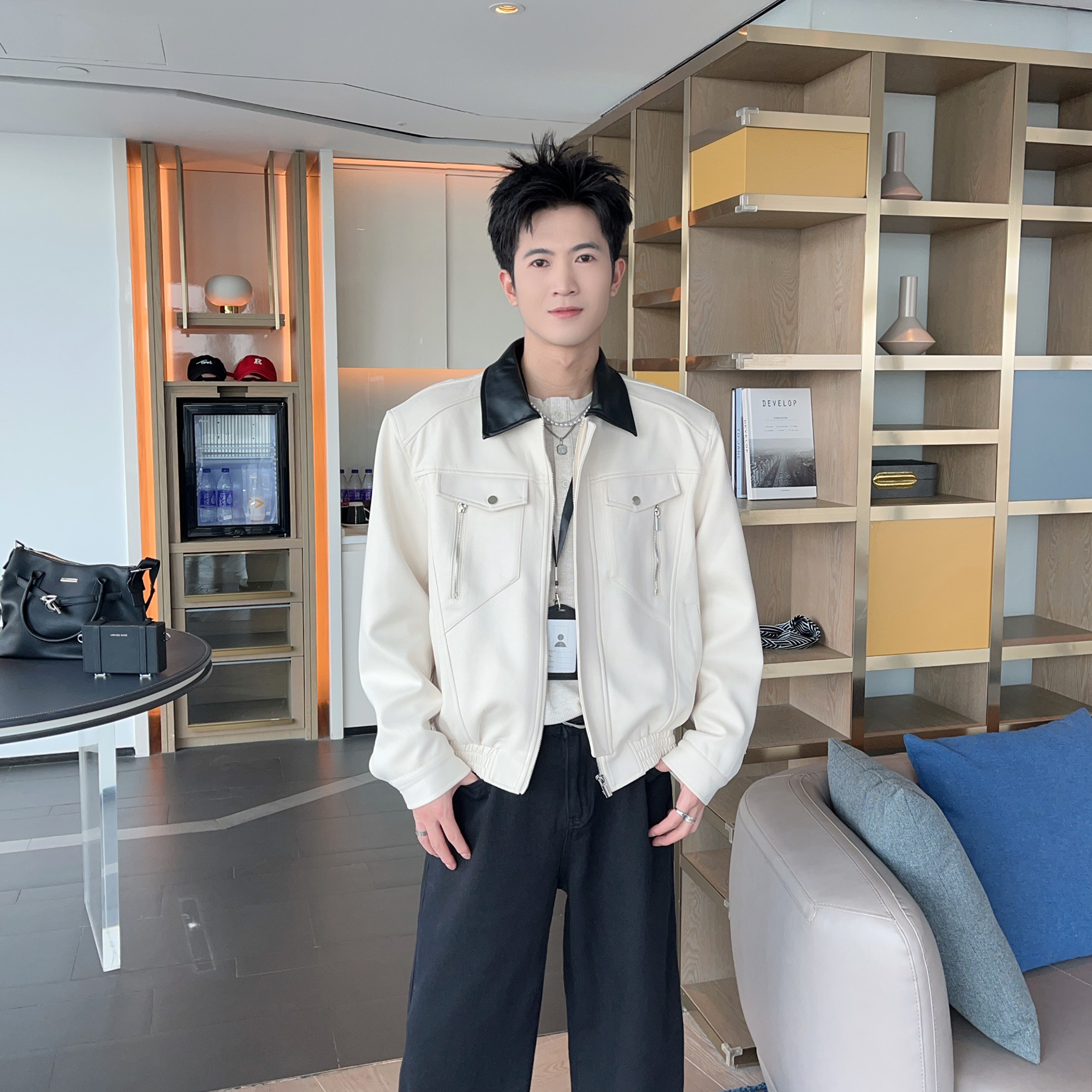 秋装巴恩风垫肩短款外套夹克男款cleanfit拼色领宽松百搭毛呢外衣