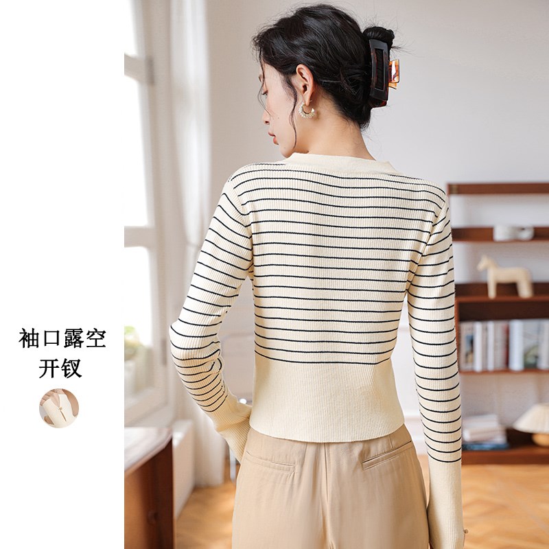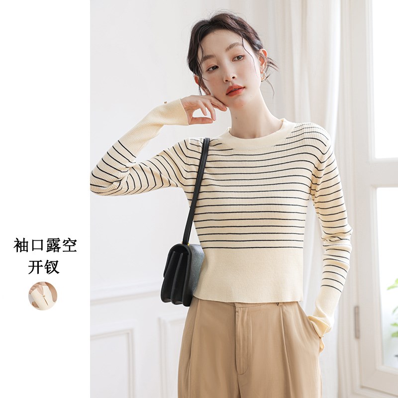 短款条纹针织衫2024新款毛衣早秋女秋冬内搭打底衫针织打底秋上衣
