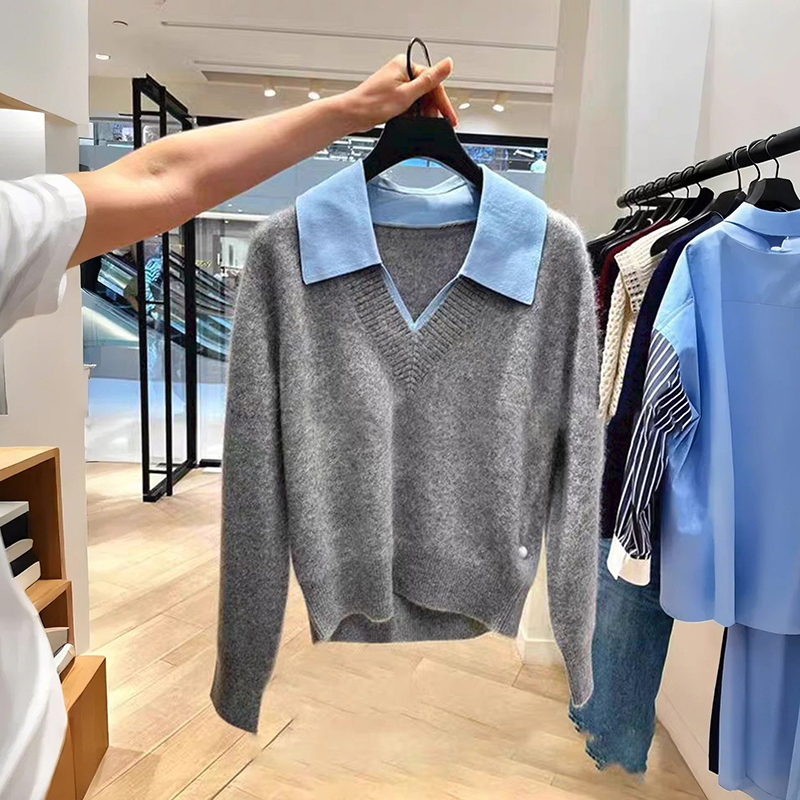 张娜拉~款S家2024秋冬时尚优雅拼色翻领针织套头假两件柔软上衣女