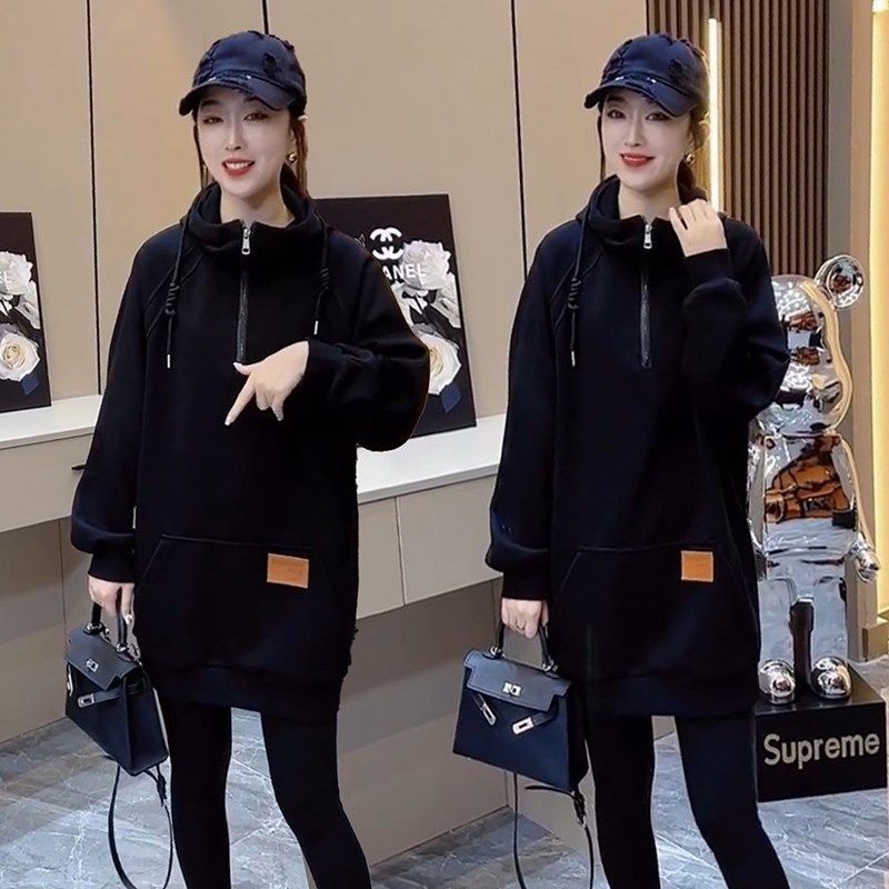秋冬季新款加绒保暖连帽卫衣女中长款半拉链宽松遮肉显瘦加厚上衣