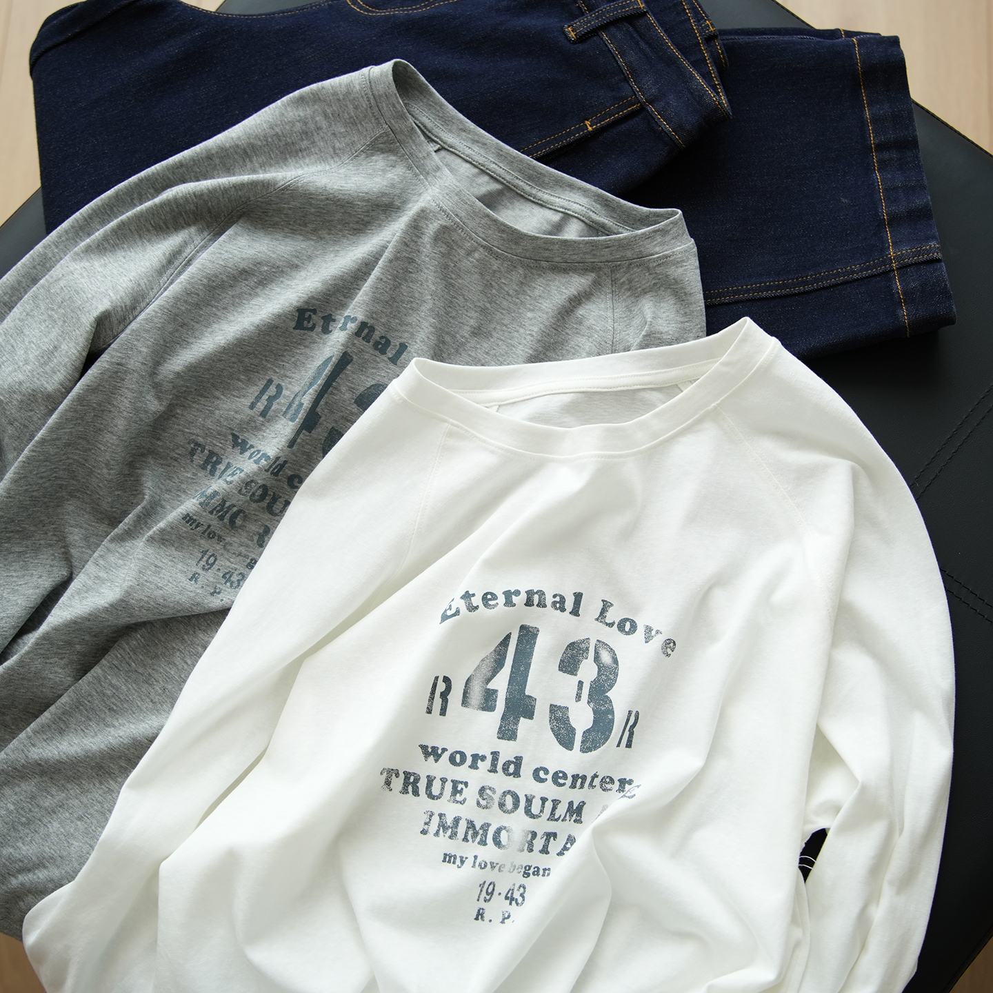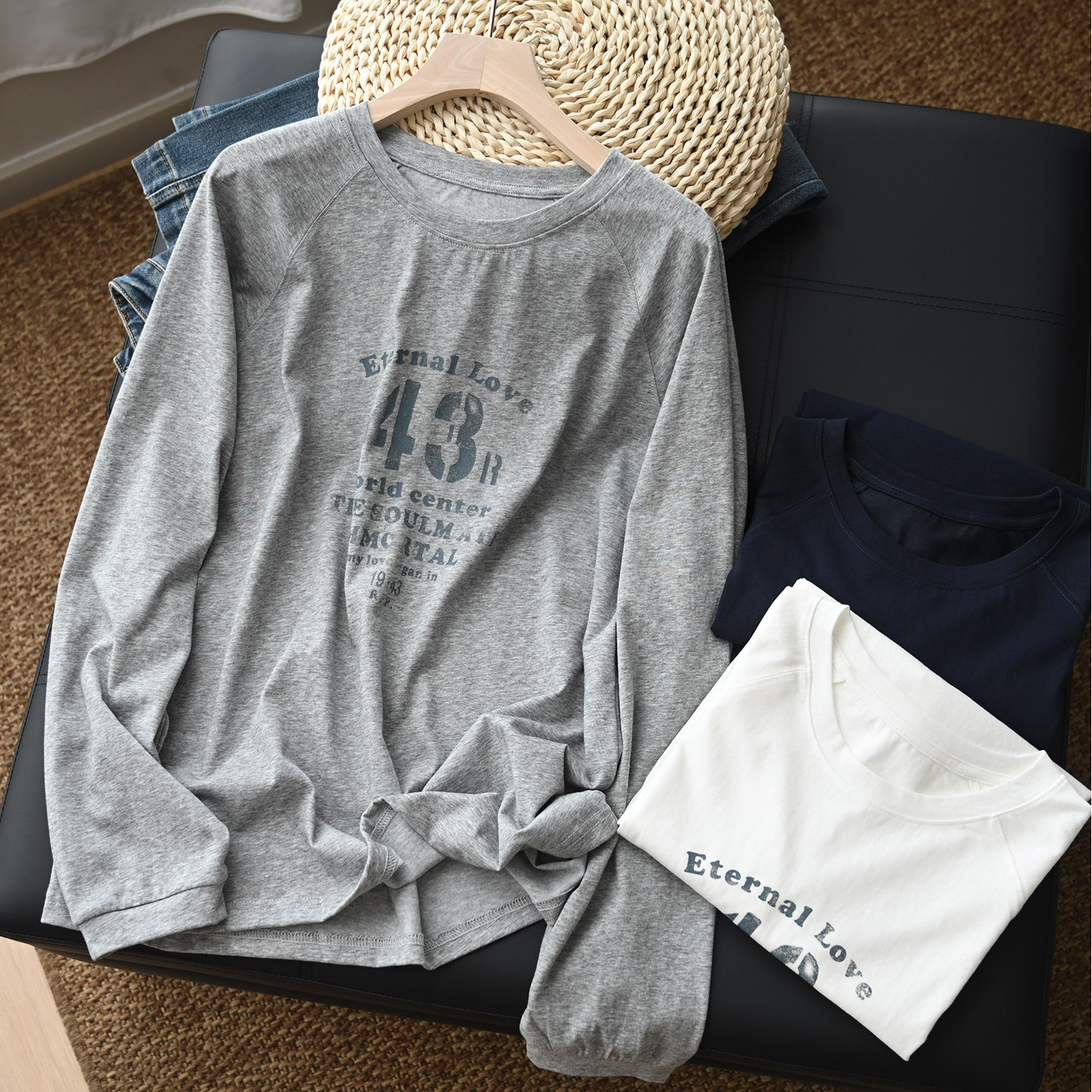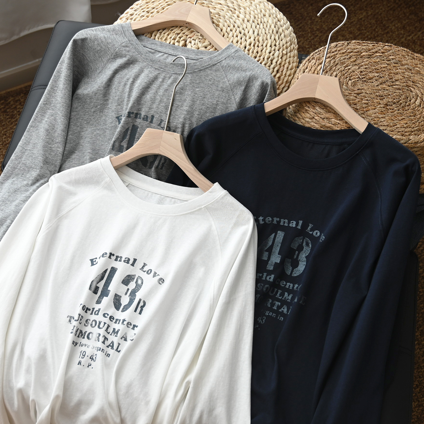 165g 女士做旧印花长袖T恤 插肩款字母打底衫 宽松款 秋款 女装