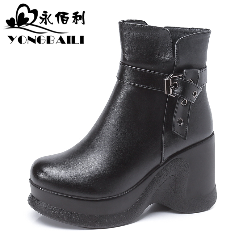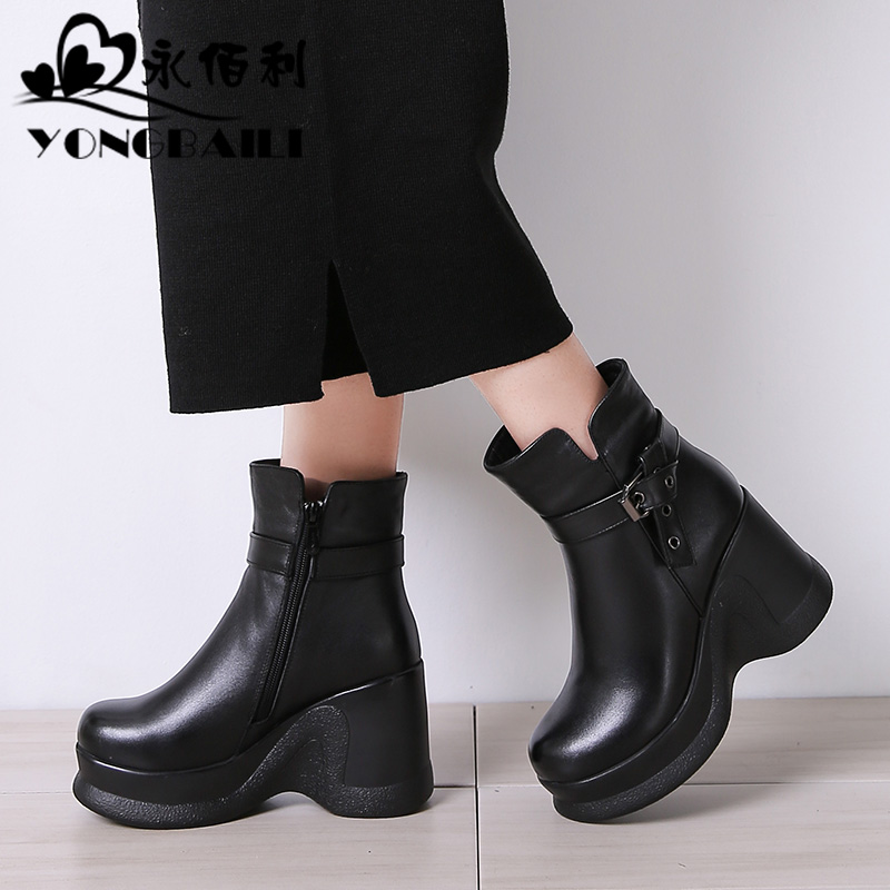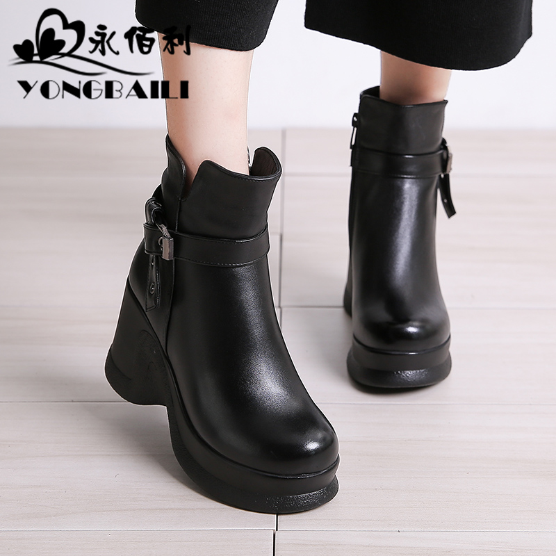 2025冬新款松糕头层牛皮短靴女真皮休闲厚底女高跟鞋靴子加绒保暖