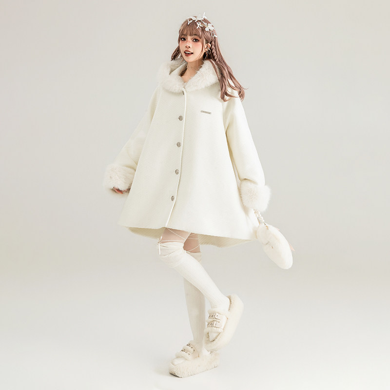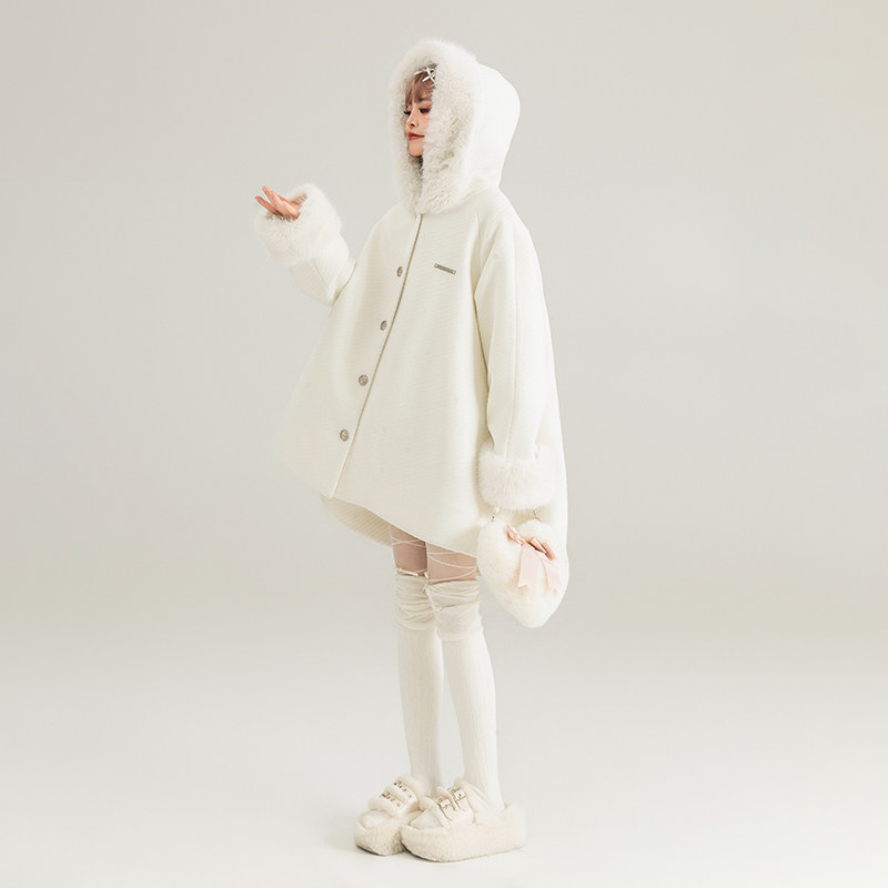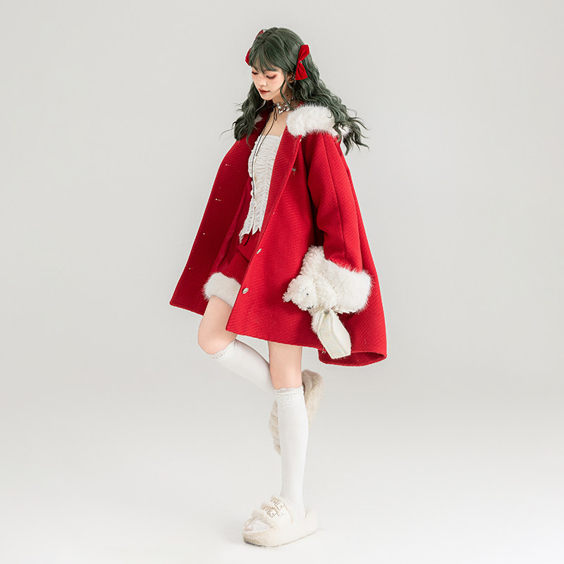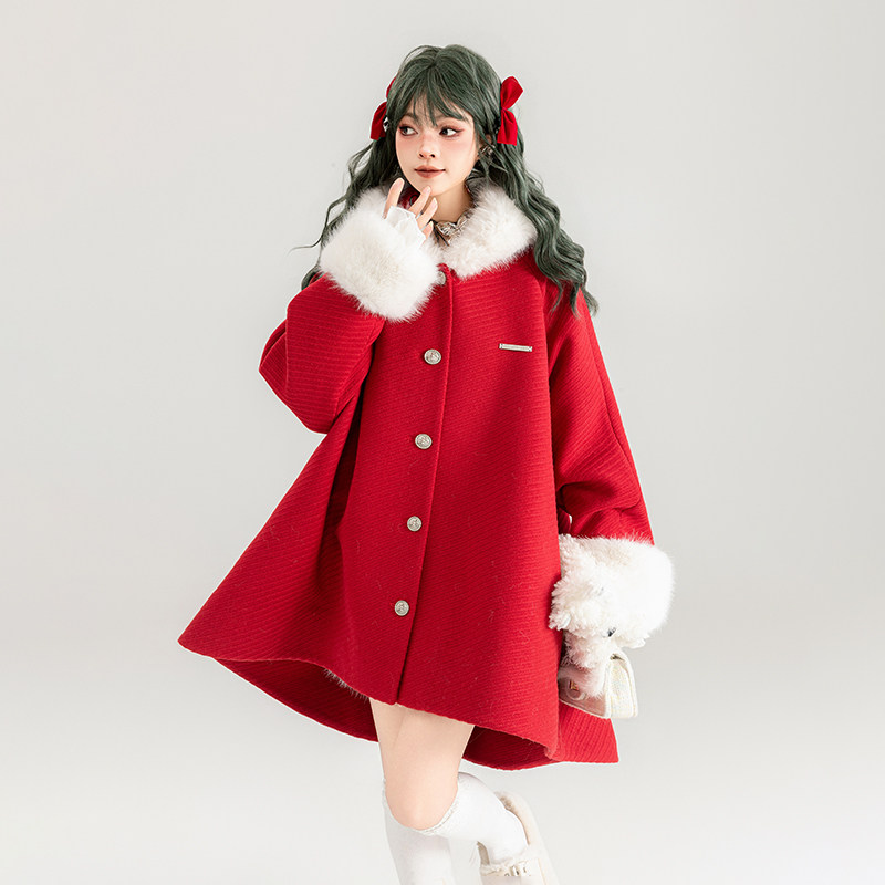 KEIKO 千金风斗篷型红色毛呢外套女秋冬大毛领显瘦连帽呢子大衣