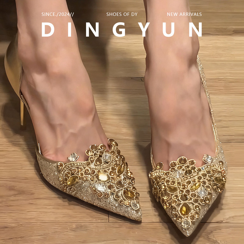 【丁允】中式秀禾婚鞋新娘鞋法式中空包头凉鞋女水钻高跟鞋细跟女