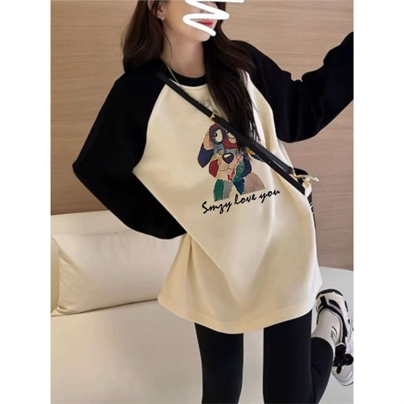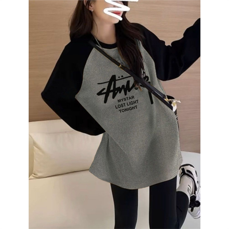 拼色德绒加厚长袖t恤女设计中长款韩版宽松内搭打底衫洋气上衣ins