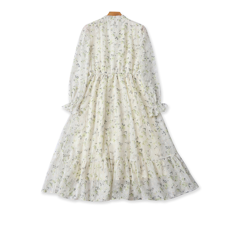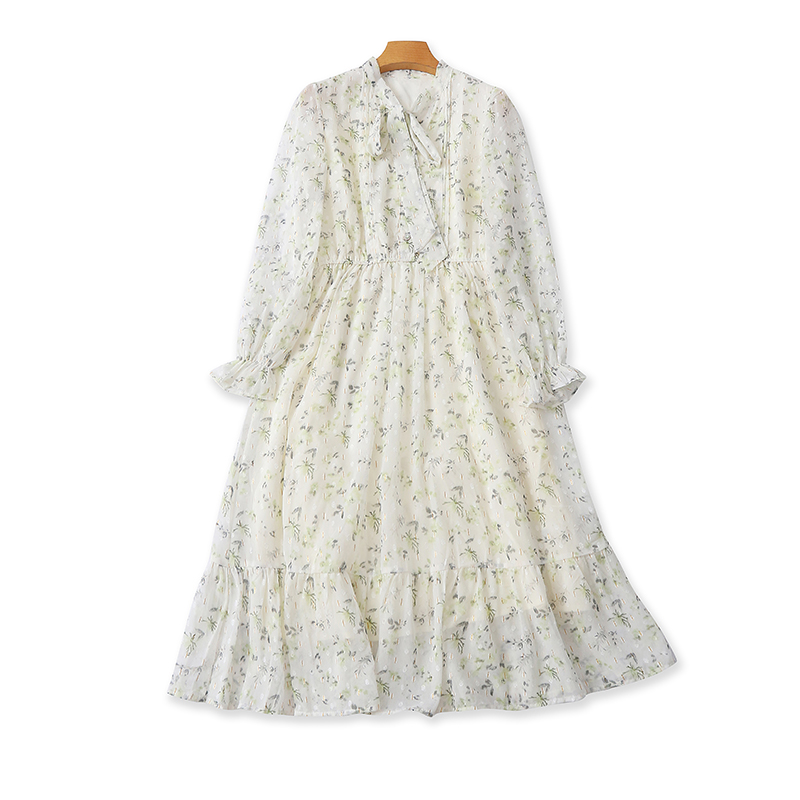 法式碎花系带连衣裙 春秋季新款清新女中长款气质雪纺长袖裙19282