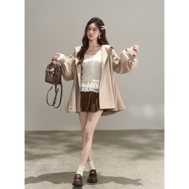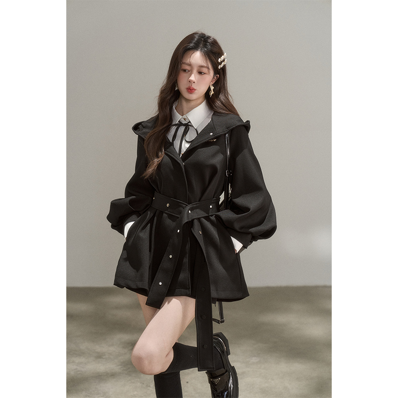 慵懒风黑色连帽休闲宽松风衣外套女秋冬季2025新款设计感气质大衣