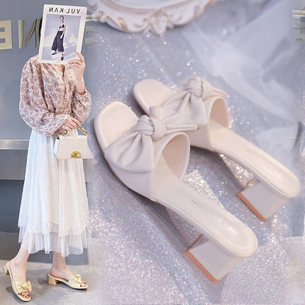 韩版粗跟拖鞋女夏外穿时尚仙女风蝴蝶结一字拖百搭中跟女士凉拖鞋