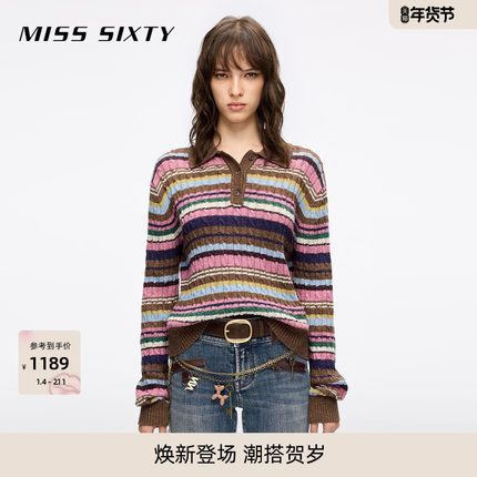 Miss Sixty25秋新款羊毛混纺针织衫女Polo领彩色条纹短款上衣毛衣