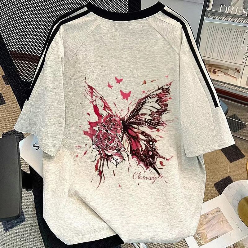 2025年夏季新款男女童蝴蝶印花三条杠t恤短袖中大童宽松百搭上衣