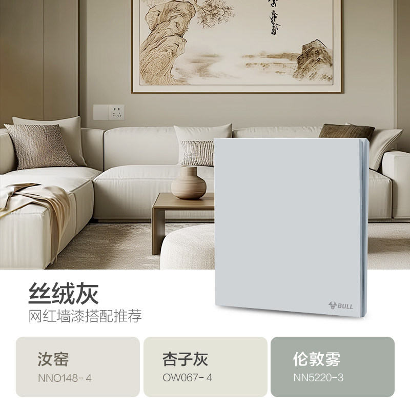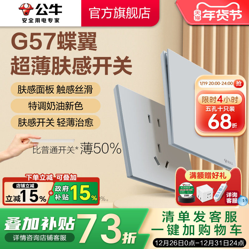 公牛蝶翼超薄G57肤感开关五孔插座16a面板哑光奶油风丝绒灰新品