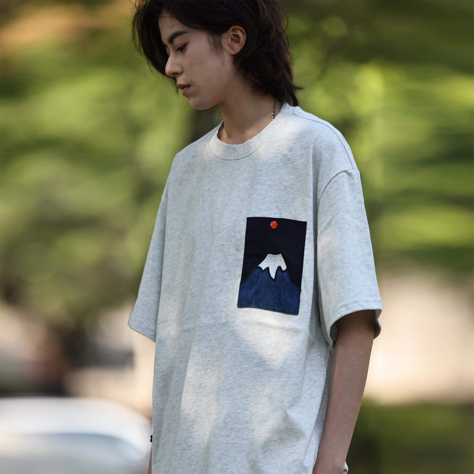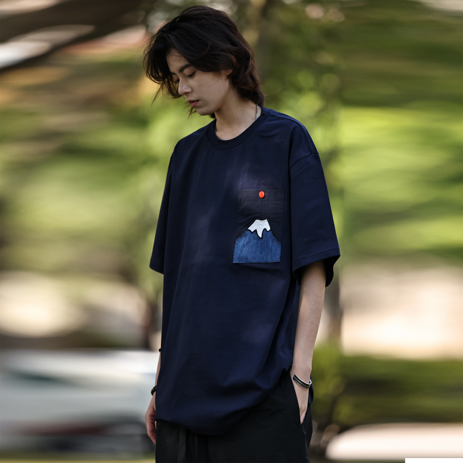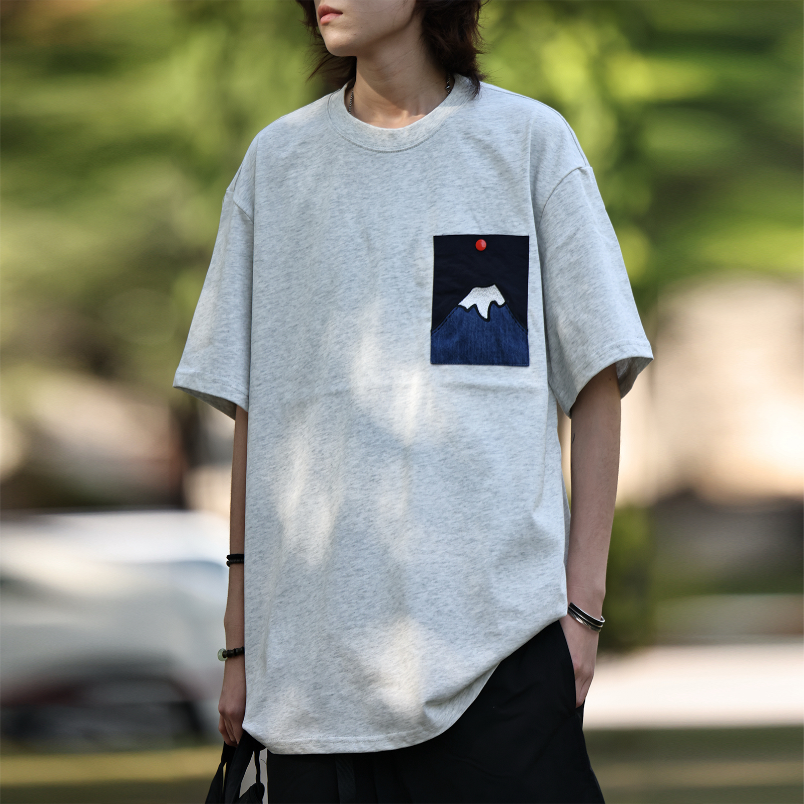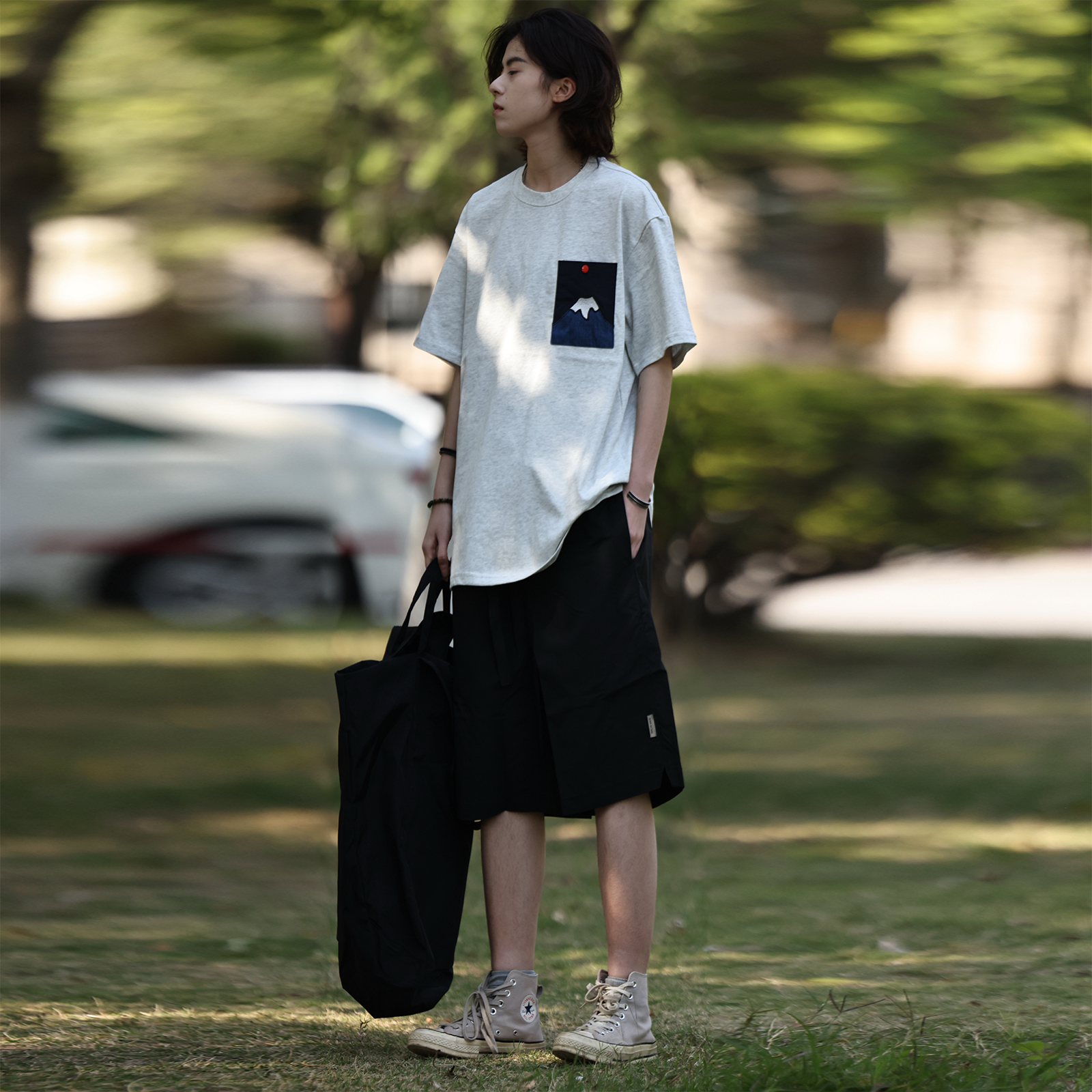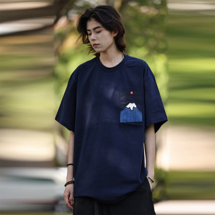 Nobodyknows日系复古口袋刺绣圆领短袖T恤趣味卡通男女款半袖衫潮
