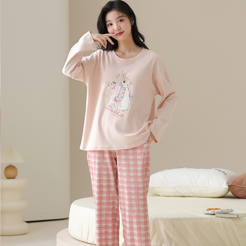 浪莎带胸垫睡衣女春秋款纯棉圆领长袖休闲女士可爱卡通家居服套装