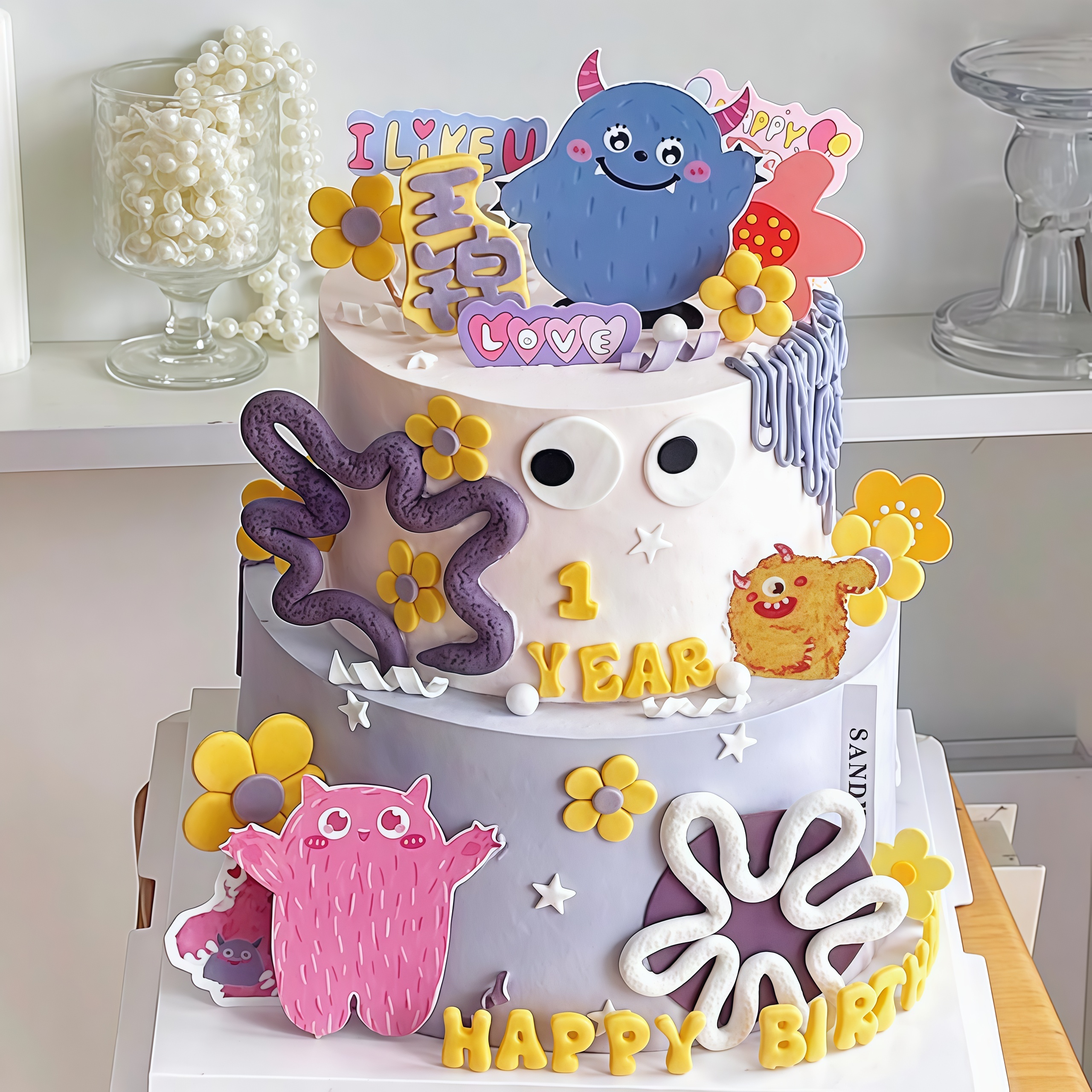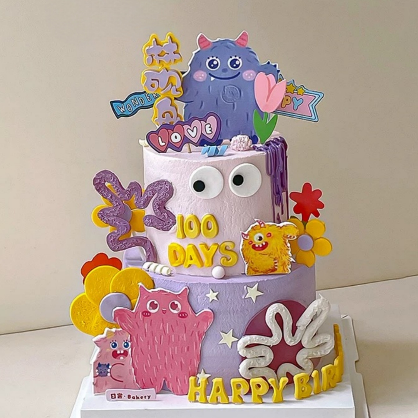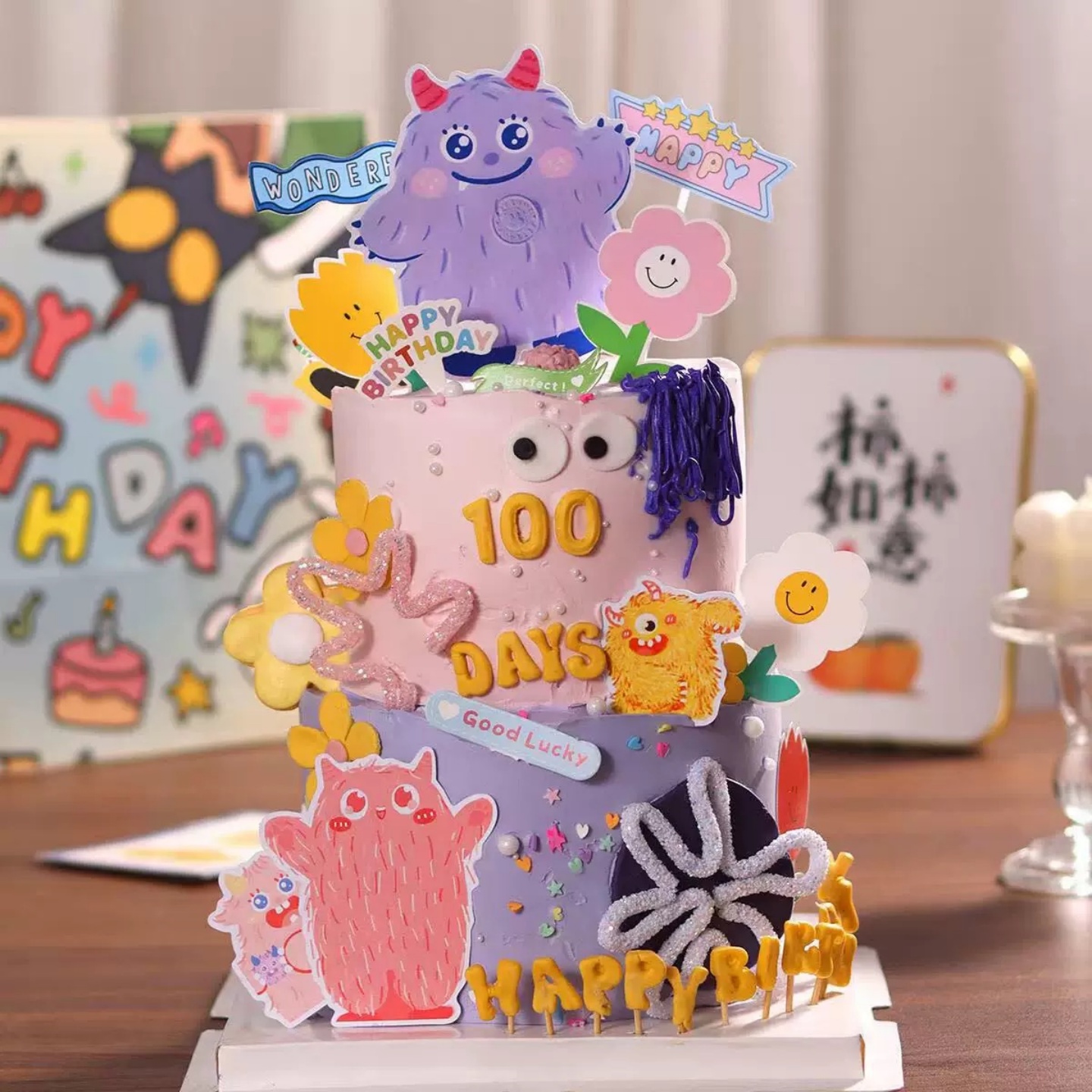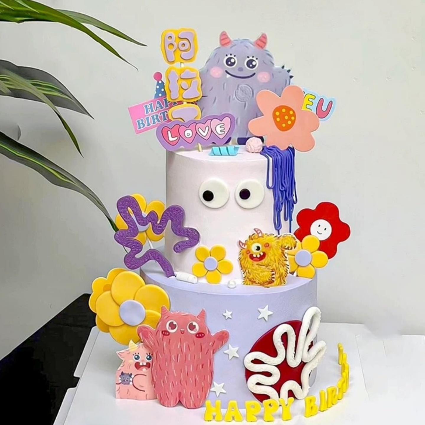 卡通多巴胺小怪兽插牌蛋糕装饰彩色软条小花儿童生日甜品装扮插件