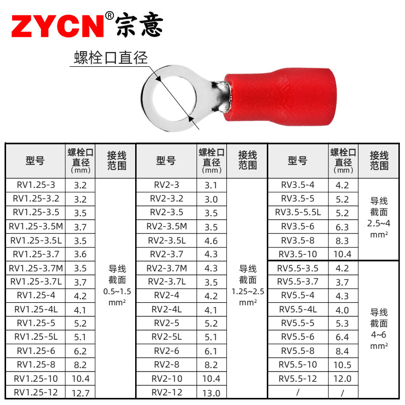 RV1.25圆形预绝缘端子O型冷压接线端子小包铜鼻子线鼻子压线4平方