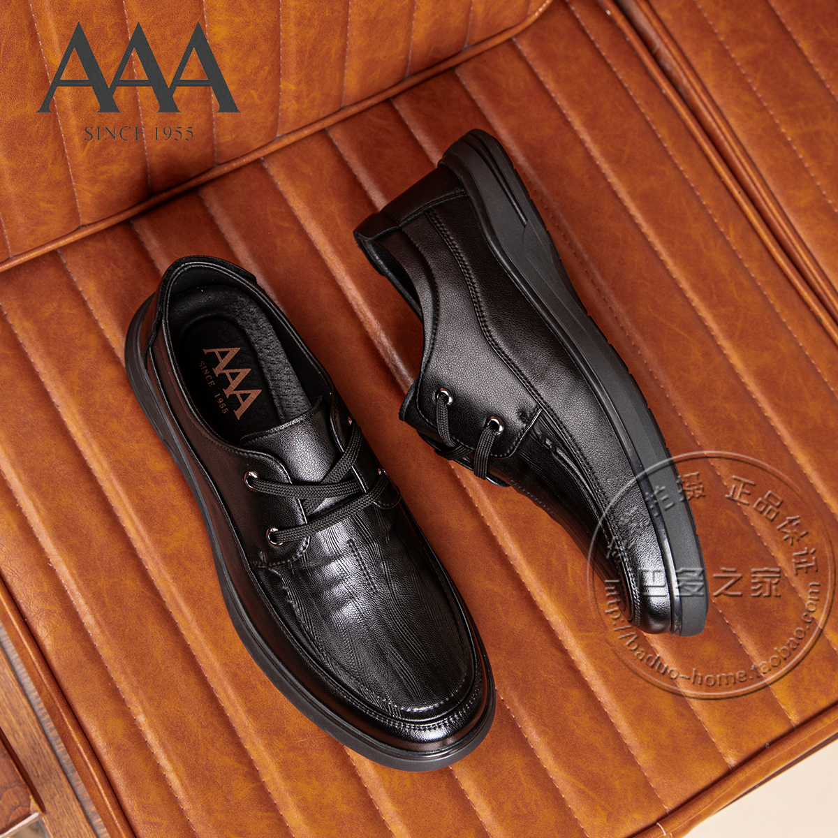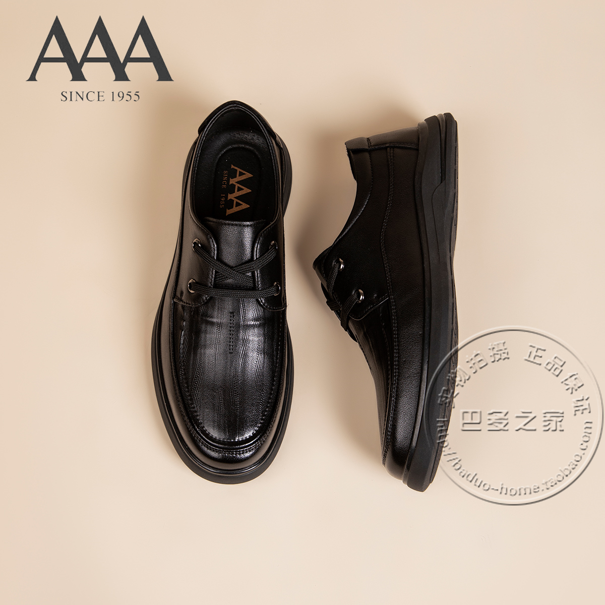 AAA男鞋合成革竖条暗纹理面三杠防皱纹系带正装休闲皮鞋黑色单鞋