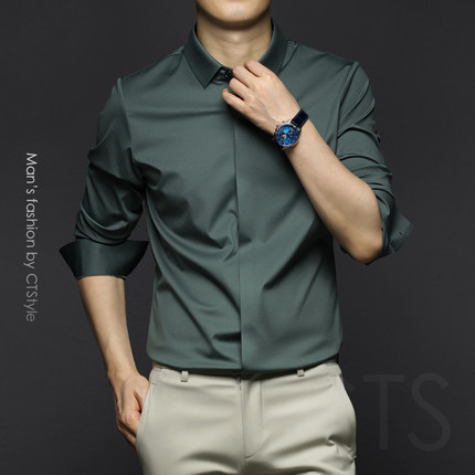 春秋季男士丝光棉长袖衬衫冰丝修身免烫衬衣2025新款商务休闲男装