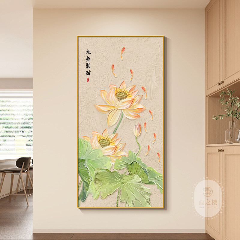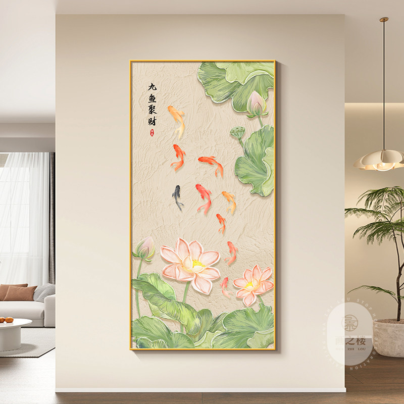 九鱼聚财入户玄关装饰画荷花鲤鱼图新中式竖版正对门走廊过道挂画