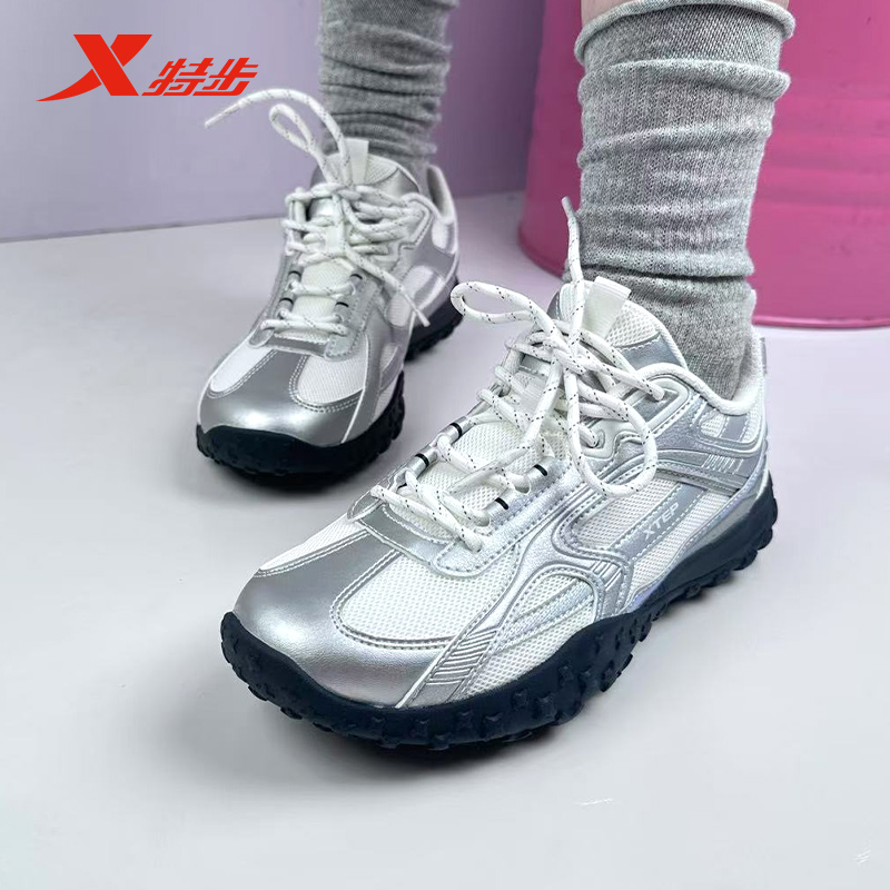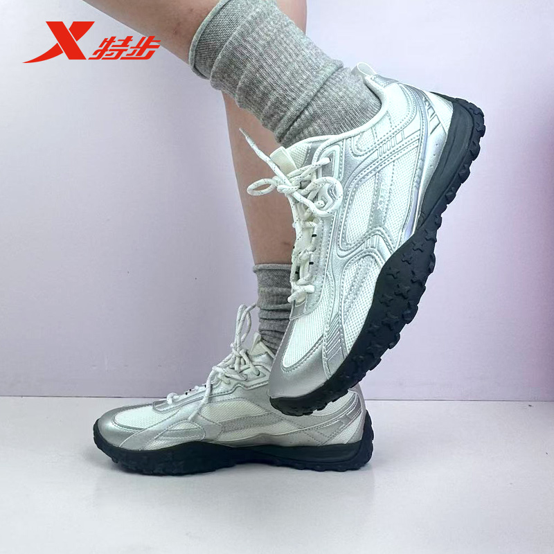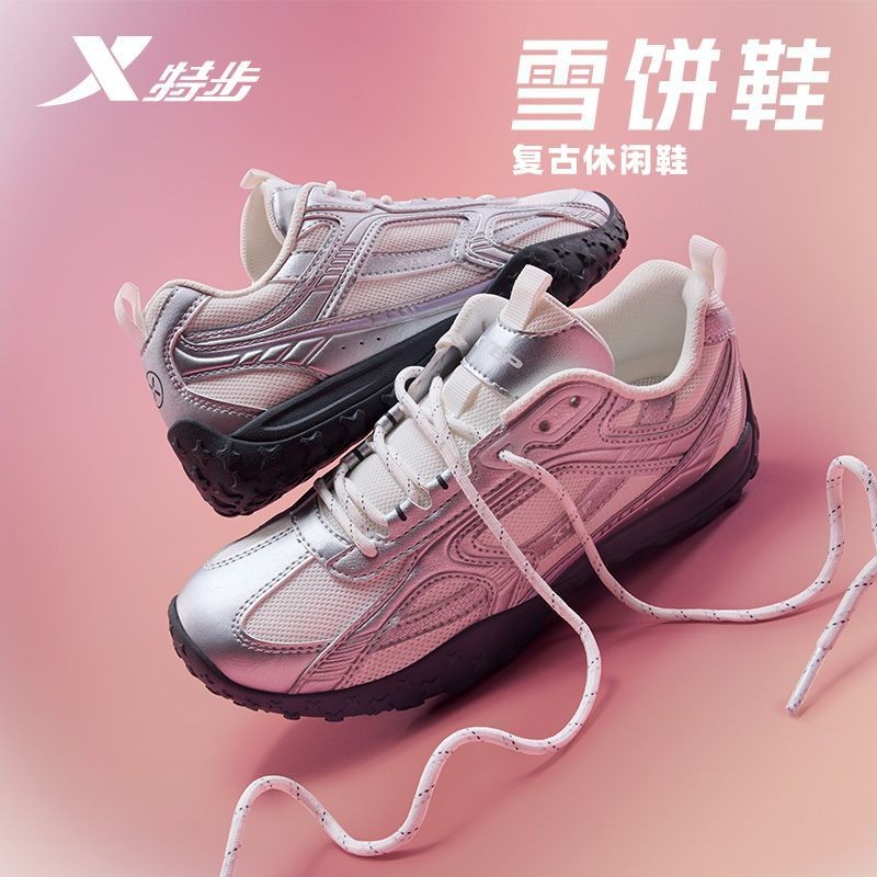 特步雪饼鞋女2025芭蕾鞋女鞋新款德训鞋银色运动鞋975318320055